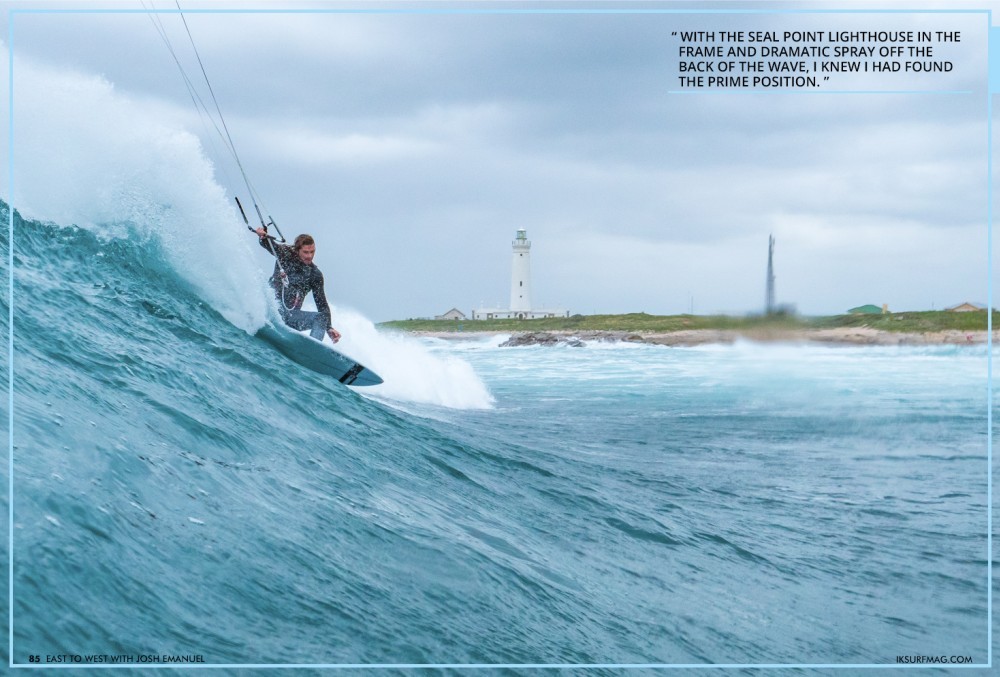 I was bundled up in my 7mm wetsuit as I swam out over the rocks with the camera in hand. I paddled to the ideal area where I could catch the point break from the right angle. The wind on the point was gusty, to put it kindly. Josh would often lose power at critical moments on the wave, making riding extremely challenging. Nevertheless, he locked in and the action began to roll. With the Seal Point Lighthouse in the frame and dramatic spray off the back of the wave, I knew I had found the prime position.