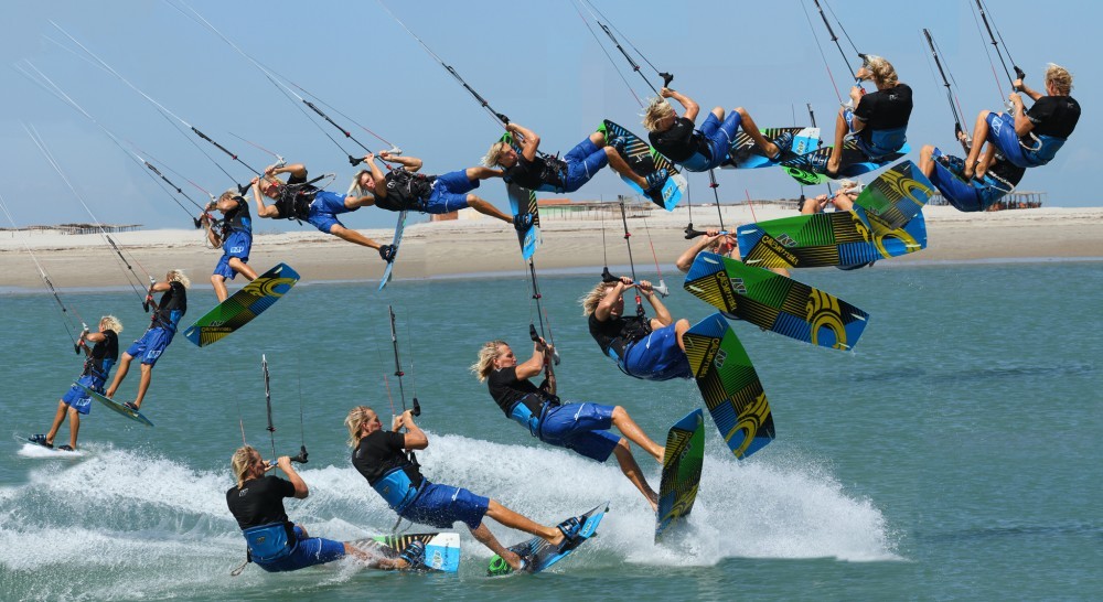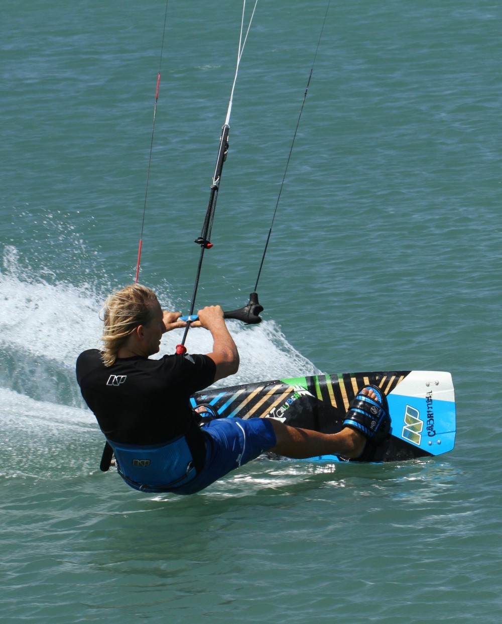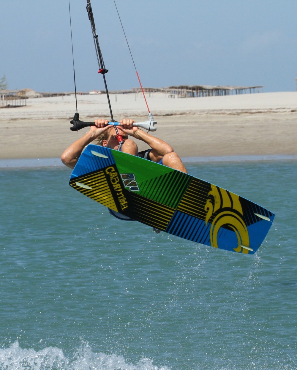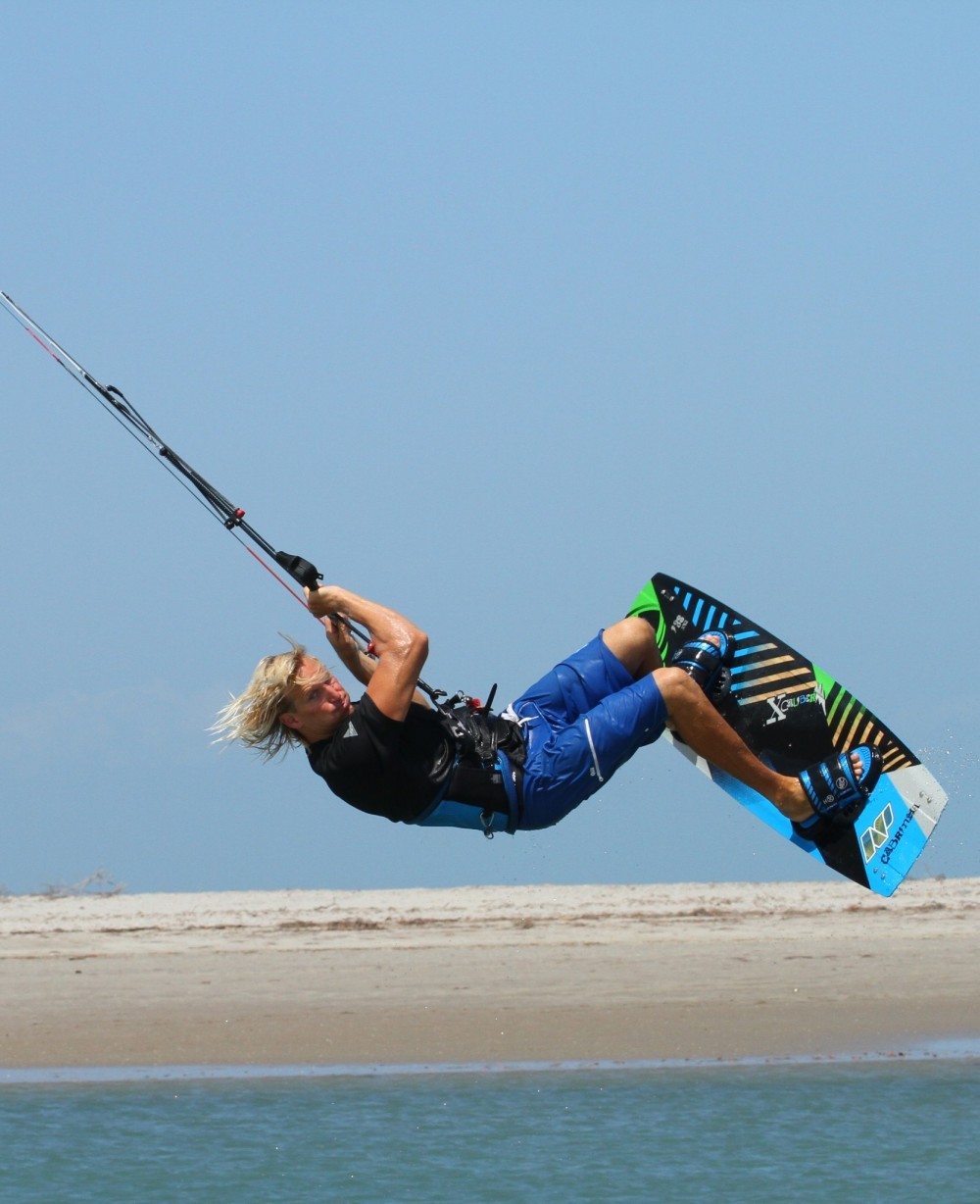 Although this is a double back loop, you don’t want to be throwing a super fast spinning rotation. For those of you who can already pull of a single back loop kite loop, it’s a similar theory. In the single version you only perform half a back loop and the kite does the rest. Here for the double if we can get one and a half the kite will do the rest. Otherwise you run the risk of over rotating when the kite pulls, which won’t be the most comfortable of landings. Your aim is to rotate at a speed that will get you around 360˚ by the time you get to the apex of your jump, the higher you go the slower you need to spin. So give the take off a bit more than you would for your normal back loop.