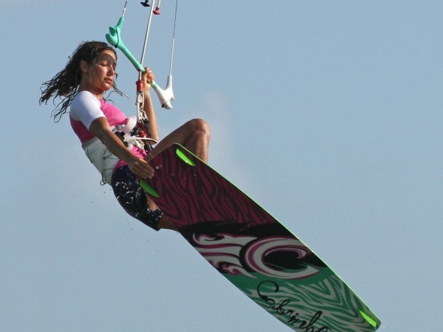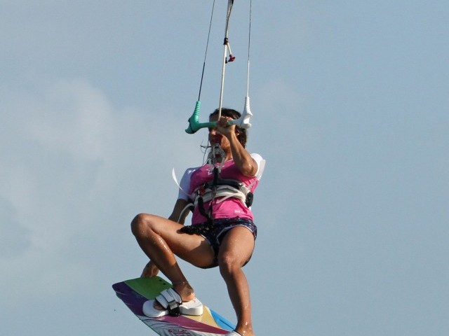 The secret to getting a grab in during the short time you have is to go for it early. Looking at the picture you can see that Karine is wasting no time in releasing her back hand and lifting the back of the board up towards her as soon as she takes off. You can also see that Karine is looking towards the tail of the board where she intends to grab it, so she can aim her hand at the target and bring hand and board together. This would not be possible if she had thrown her head around to look over her back shoulder in order to get the rotation. Having released her back hand so early she can already pull on her front hand a little bit, so long as she did send the kite back past 12 0’clock. In this jump Karine is aiming for a boned out grab, hence she just lifts her back leg, but you’re quite welcome to lift both knees if it feels more stable.