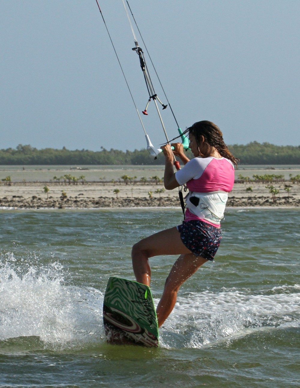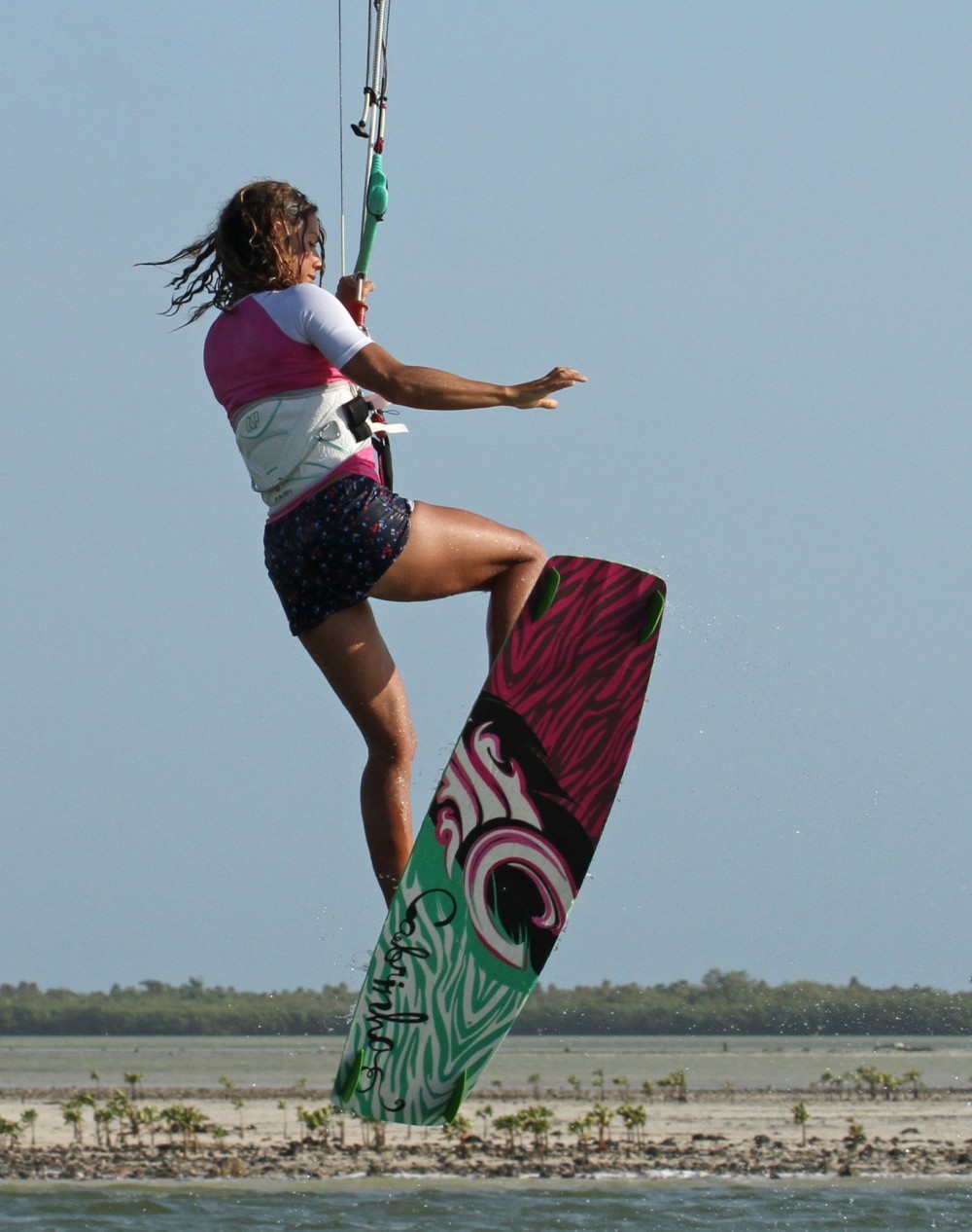 The moment of truth! Your easiest and most reachable options for the grab are either the heel side edge by the fin, or the tail itself. It’s a great idea to practice this on the beach without your kite to find out where is most natural for you. Holding a grab, rather than a little tickle is a good game plan, as you’ll have more balance with both hands occupied, so literally grab the board and pull it towards you. Once again to bone it out you can straighten the front leg by pushing your front foot away from you whilst holding the tail in close. In the picture you can see that Karine is still watching her grab, which keeps her rotation slow, and she has the bar held in, which keeps tension on the lines and the kite under control as it gently moves it above her.