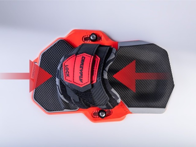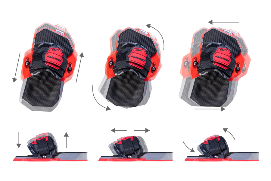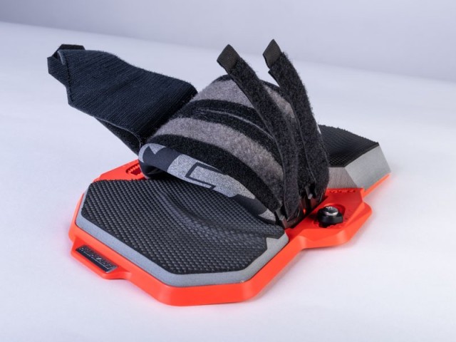 The diamond grip on the footpad ensures fast water outflow and creates superior traction. The Fusion Frame, an injection molded plastic frame, surrounds the footpad and allows direct contact with the board, reducing weight and providing the best possible connection between the rider and the board.
