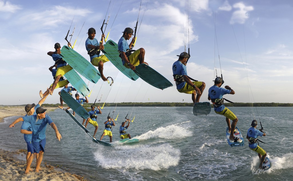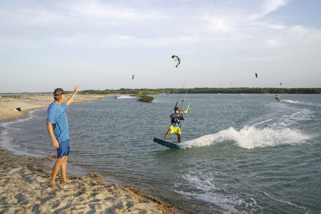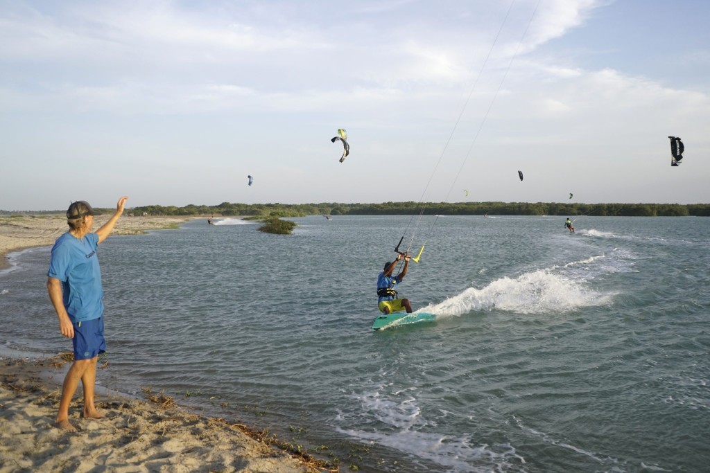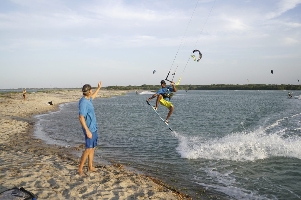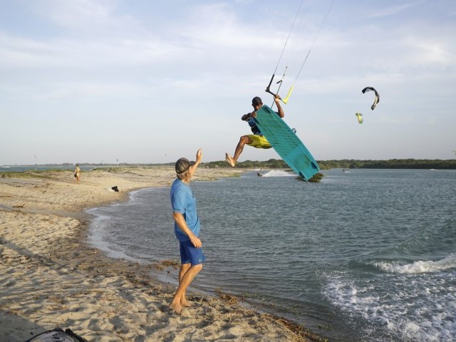 Eying up Christian’s Cap, Heliarde pops up off the water, kicking off his back leg while pulling his bar in. This will send him up, and the pull in will give him some downwind travel so that he floats down towards the waiting onesie. He takes off quite a way out, and it’s also worth noting that he doesn’t level his bar as he wants the kite to stay slightly behind him, we’ll see why shortly.