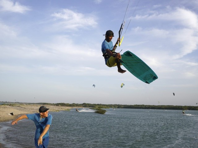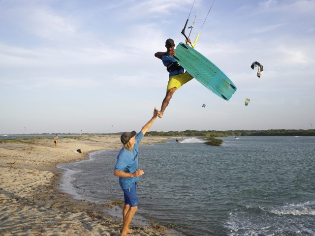 This is the tricky bit which will demonstrate your superb kite control or highlight your lack of it. From here on your path has been set but you still need to steer your way forwards, using the bar to speed up or slow down, drift right or pull left. And this is why you left the kite slightly behind you on take-off, as it can now act as both a break and accelerator. In this case taking off to your right - sheet in and you’ll slow down, move up and be pulled left, sheet out and you’ll carry on to your right and drop. These are subtle movements that work wonders. In the pic Heliarde holds his board up out of the way, extending his leg and using his foot as the crosshairs. In doing so guides his foot towards Christian’s hand. Optimo!