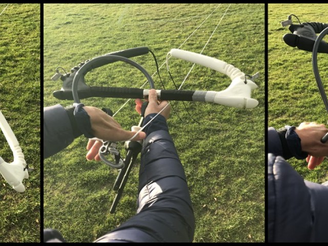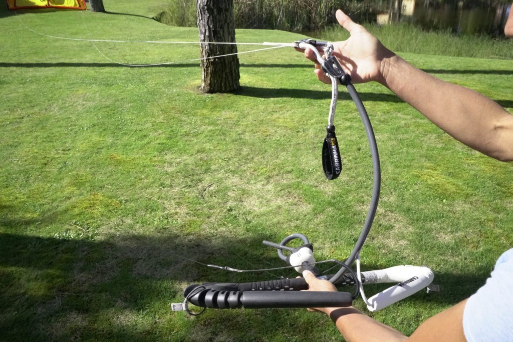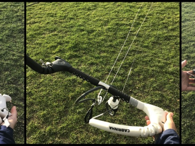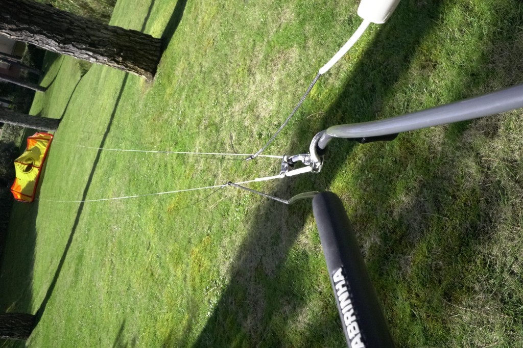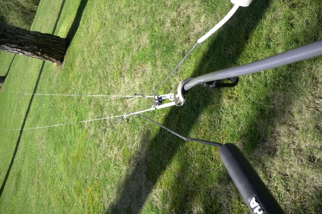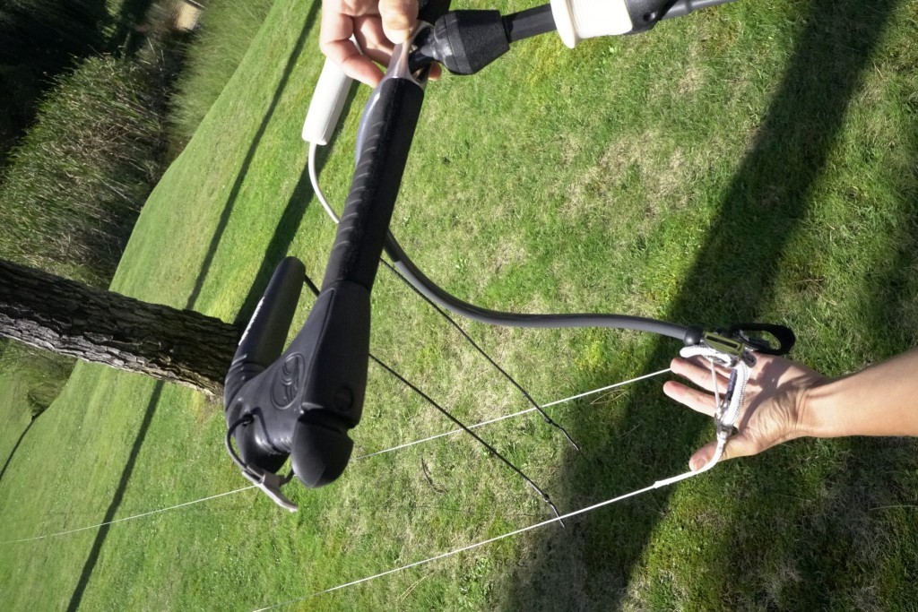Pic 10. Pull the lines tight, then with your right hand hold the steering line out to one side, give it a little shake and you should see it running freely from the bar end and your hand all the way to the rear attachment point on your kite, while the centre lines hang unhindered.