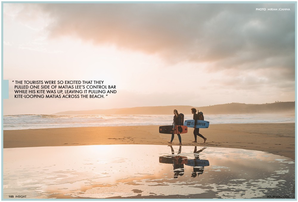 During the STOKE3 photoshoot in Cornwall, many tourists who had never seen a kitesurfer before wanted to take a picture with two FLYSURFER athletes. Unfortunately, the tourists were so excited that they pulled one side of Matias Lee’s control bar while his kite was up, leaving it pulling and kite-looping Matias across the beach. I took Matias to the hospital, but after a few stitches on his head, we were able to continue with the shoot. Matias then helped us behind the lens.