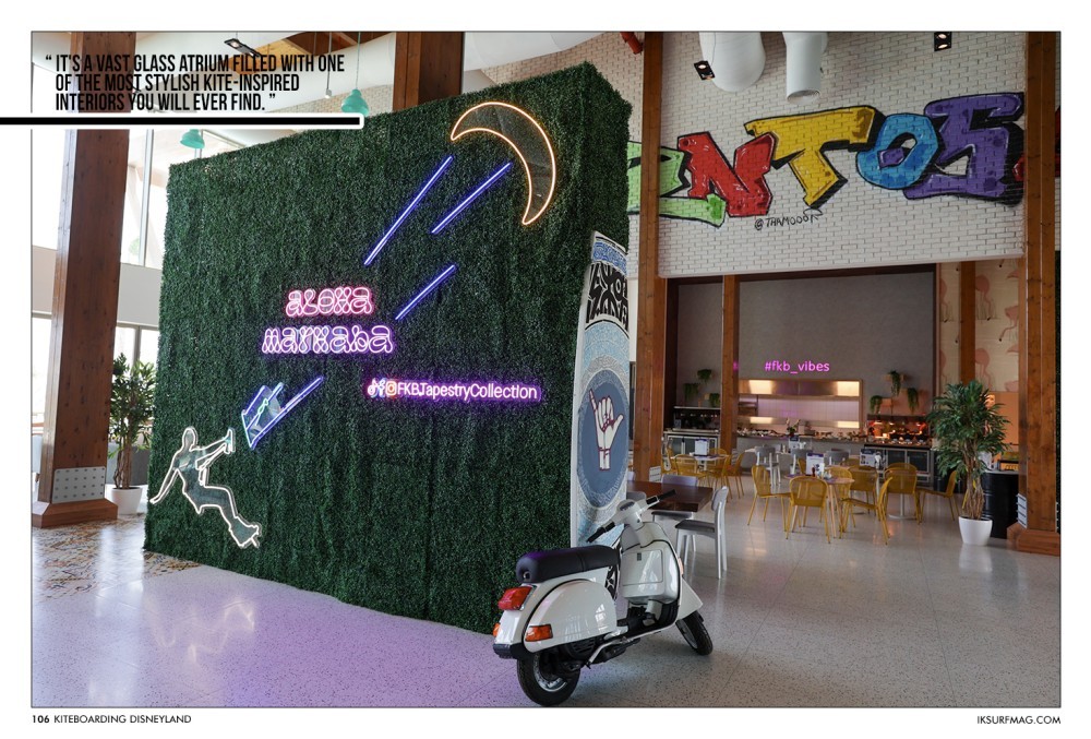 Walking into the lobby at the Hilton Fuwairit Kite Beach is an experience; it's a vast glass atrium filled with one of the most stylish kite-inspired interiors you will ever find. With VW campers, cool scooters everywhere, and art dedicated to our sport that's larger than anything I’ve ever seen, it feels like you have stepped into Willy Wonker's chocolate factory, except it’s not chocolate; it's kites.