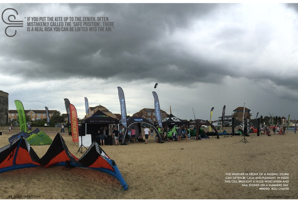 If you are on the water and you do get hit by a sudden increase in the wind speed as a storm cell hits, again keep the kite on the deck, right at the edge of the window on the sea or the beach. When the kite is in this position, it will drag you along the surface at worst. If you put the kite up to the zenith, often mistakenly called the ‘safe position’, there is a real risk you can be lofted into the air. Even if you fully depower your kite, there is a chance it can invert and then unleash all manner of hell.