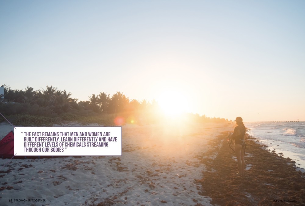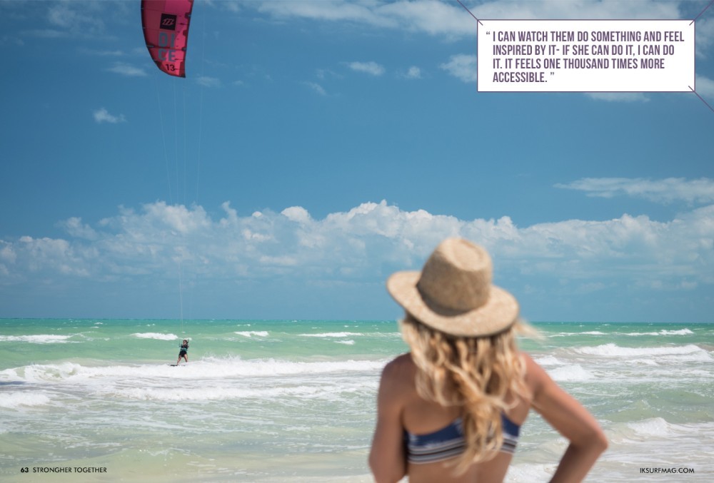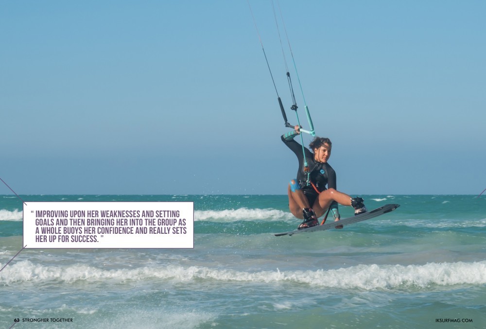 I’ve experienced the need for female-drive progression often during my kite career. When you’re the only woman on the water that day, it’s easy to dismiss what the men are doing. It’s easy to think, “Oh wow, look at what they’re doing! But they’re way better than I am, I can’t do that.” It’s easy for me to rely on my own skill level and ignore the progression of my male peers because I have an excuse-they’re not as relatable. While riding with my female peers, I’m pushed to identify with the group around me. I can watch them do something and feel inspired by it- If she can do it, I can do it. It feels one thousand times more accessible.