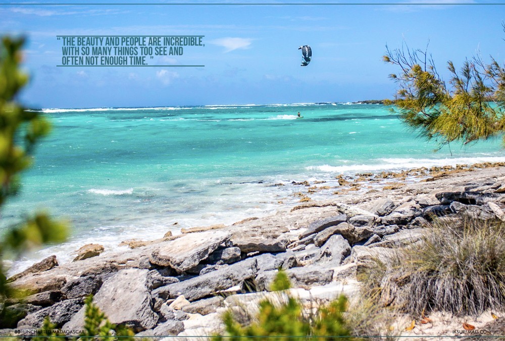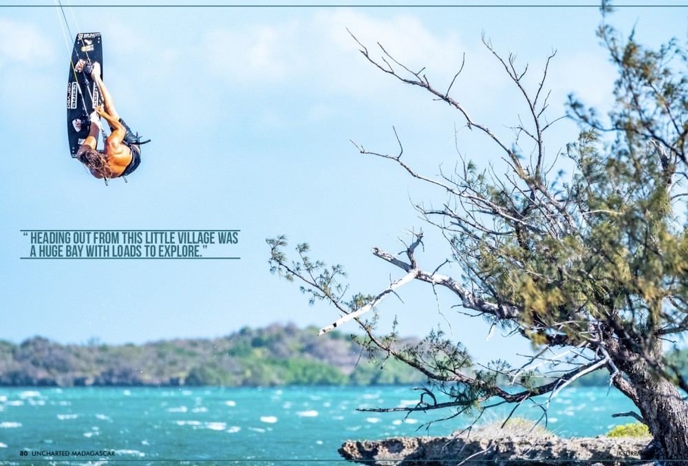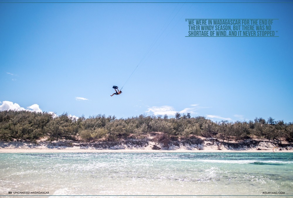The bay was an unbelievable kite spot! The neap tide created an enormous sand bar, linking an island to the mainland, creating a perfectly flat spot for freestyle and old school tricks. We were in Madagascar for the end of their windy season, but there was no shortage of wind, and it never stopped; blowing an average of 20 to 25 knots every day. However, if you are looking for waves, the north does not offer the best waves, but you can still enjoy a few little kickers for big air tricks.