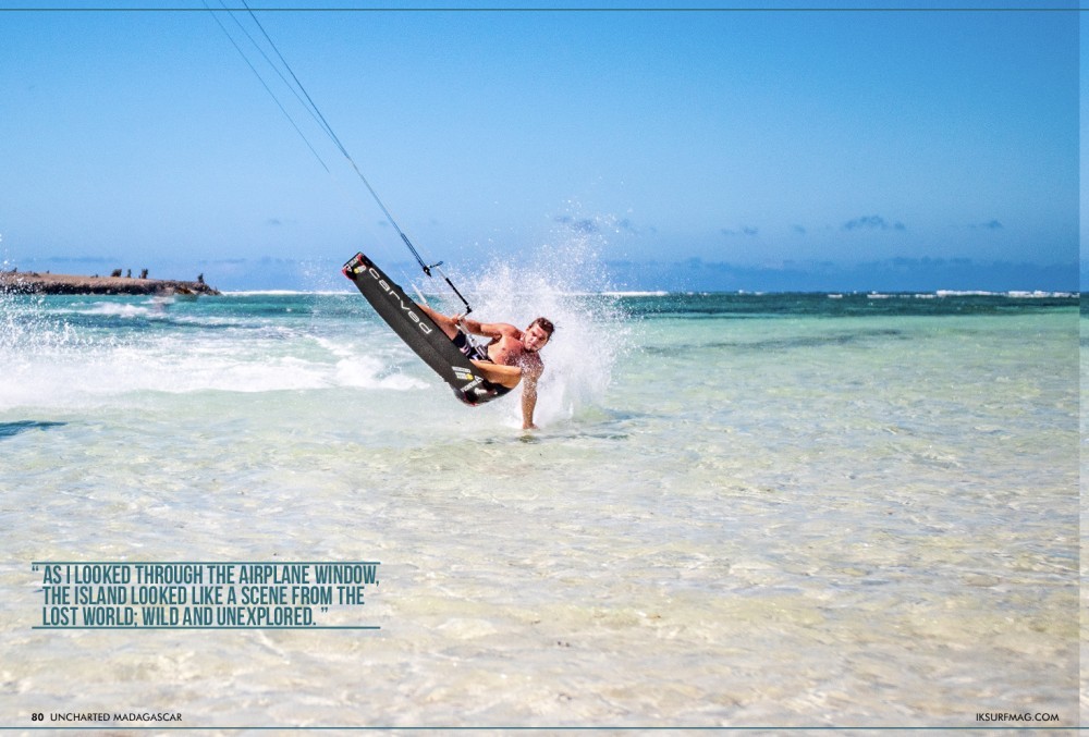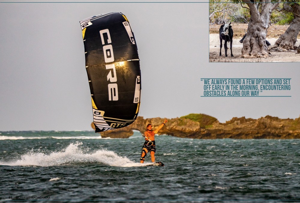 We woke up early, and with only a 12m kite (while we waited for the rest of our equipment to arrive on the next flight) we headed out into the beautiful blue waters of Sakalava Bay for a session.