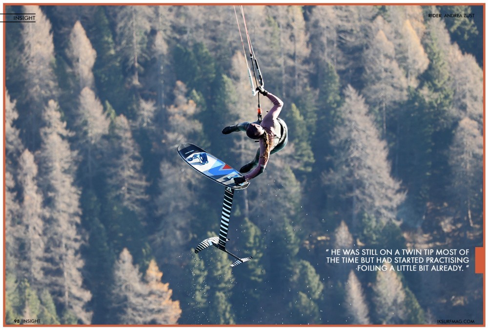 I started hydrofoiling two years ago after I met Peer and started kiting in Switzerland on all the different lakes with him and the other Swiss kite addicts. The conditions here aren't always great and we get a fair amount of light wind days. After having spent most weekends at the beach watching all the hydrofoilers have their fun and not being able to kite with a twin tip, I decided to go for it too. Supported by Peer, I fell for it instantly; I loved how much fun you could have in so little wind. Then I started to do little jumps and got into hydrofoil freestyle.