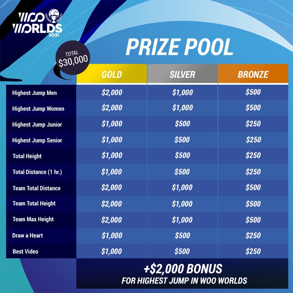 Team Total Height – Groups of 5 try to accumulate the total jump height in the competition period. #wooworlds #team_yourteamname – Top 5. Sept. 1-7 (Prize: $2000)