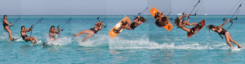 - Pic 7. Karine grabs the bar with her back hand and pushes her legs away from her, pointing the board slightly off the wind to gather speed.