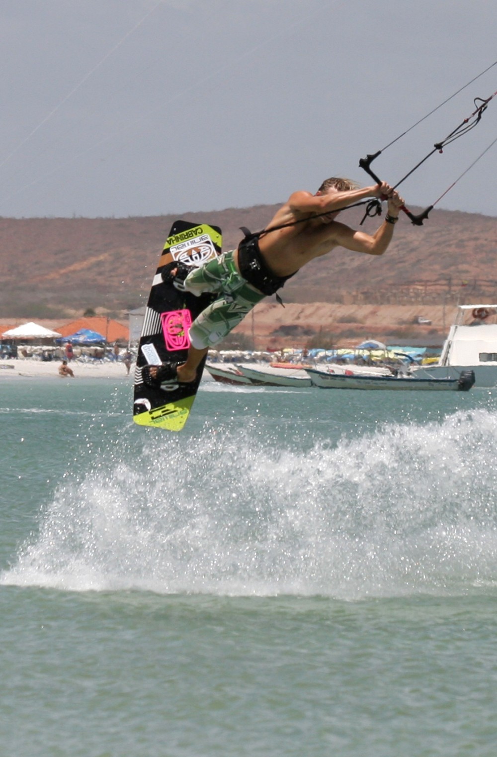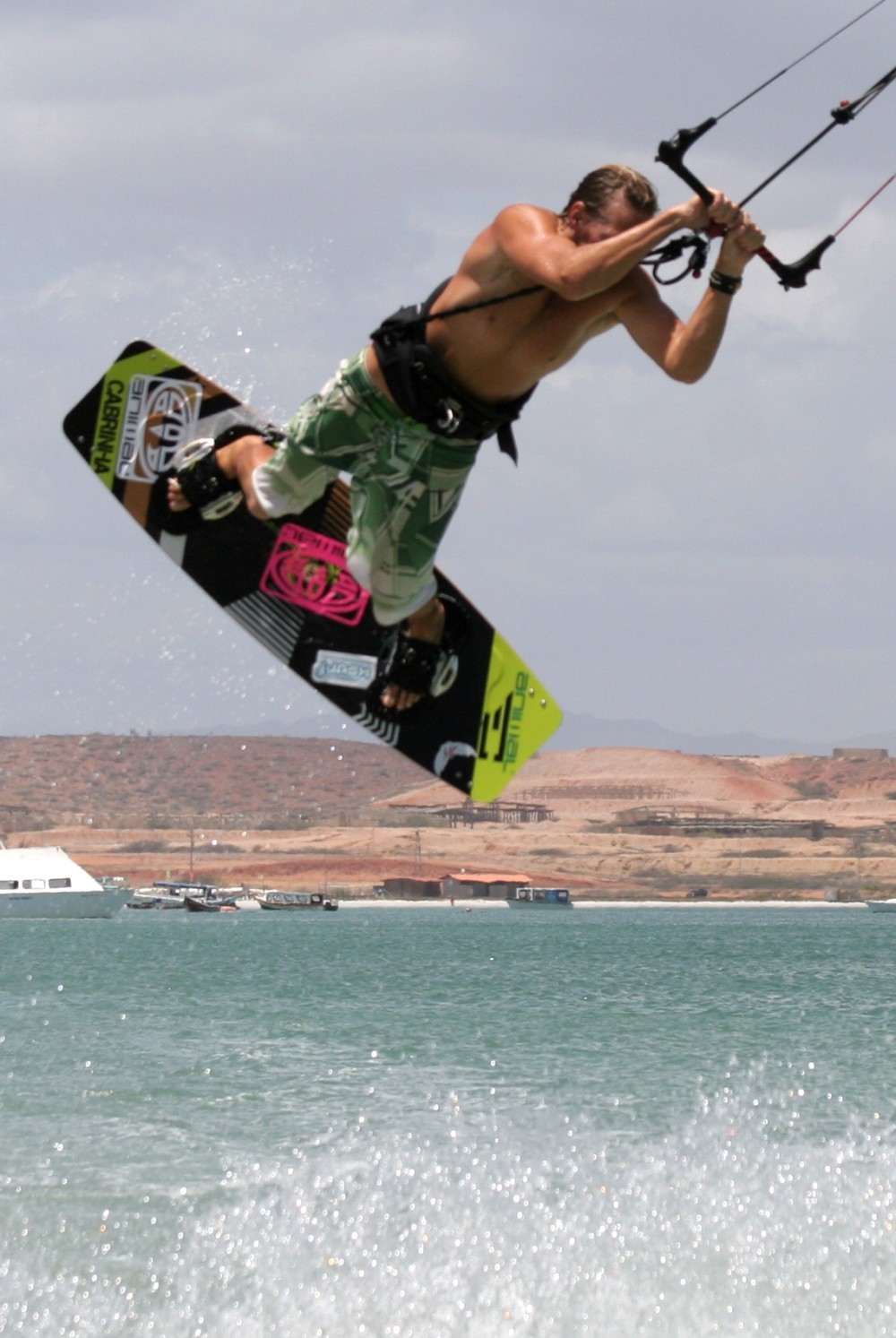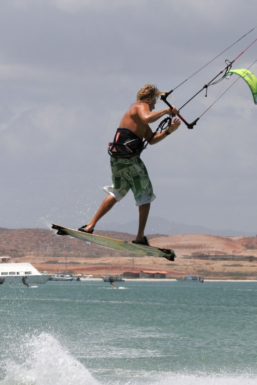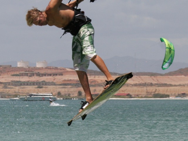 - Pic 3. A split second after take off Christian is in full “boobies upwind” mode, stretched out and ready to swing everything through.