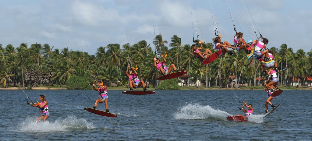 This part should be fairly straight forward as you’ll be kicking off your back foot, turning your head and lifting your front knee – just like a front loop, or roll. However it’s not uncommon to throw oneself across the board into a front rotation, which will still work, but it will also mean that you’ll travel downwind and under the kite more, which could lead to an unresponsive kite come the down loop. Make sure you kick yourself away from the board’s edge, don’t flatten it and throw yourself over. You can see that Karine is going up, sounds obvious but it’s because she kicked herself upwind and away from the board. Her front knee is lifting, which is her axis of rotation, and she’s already redirecting the kite towards 12 o’clock with the bar in on the sweet spot. Firstly because she gave it a good send and secondly because she needs the kite moving forward in preparation for the down loop. If she leaves the kite behind her, she’ll have no pull when she down loops and thus will drop and stop, and if she lets the bar out the result will be much the same!