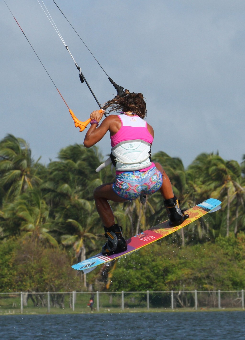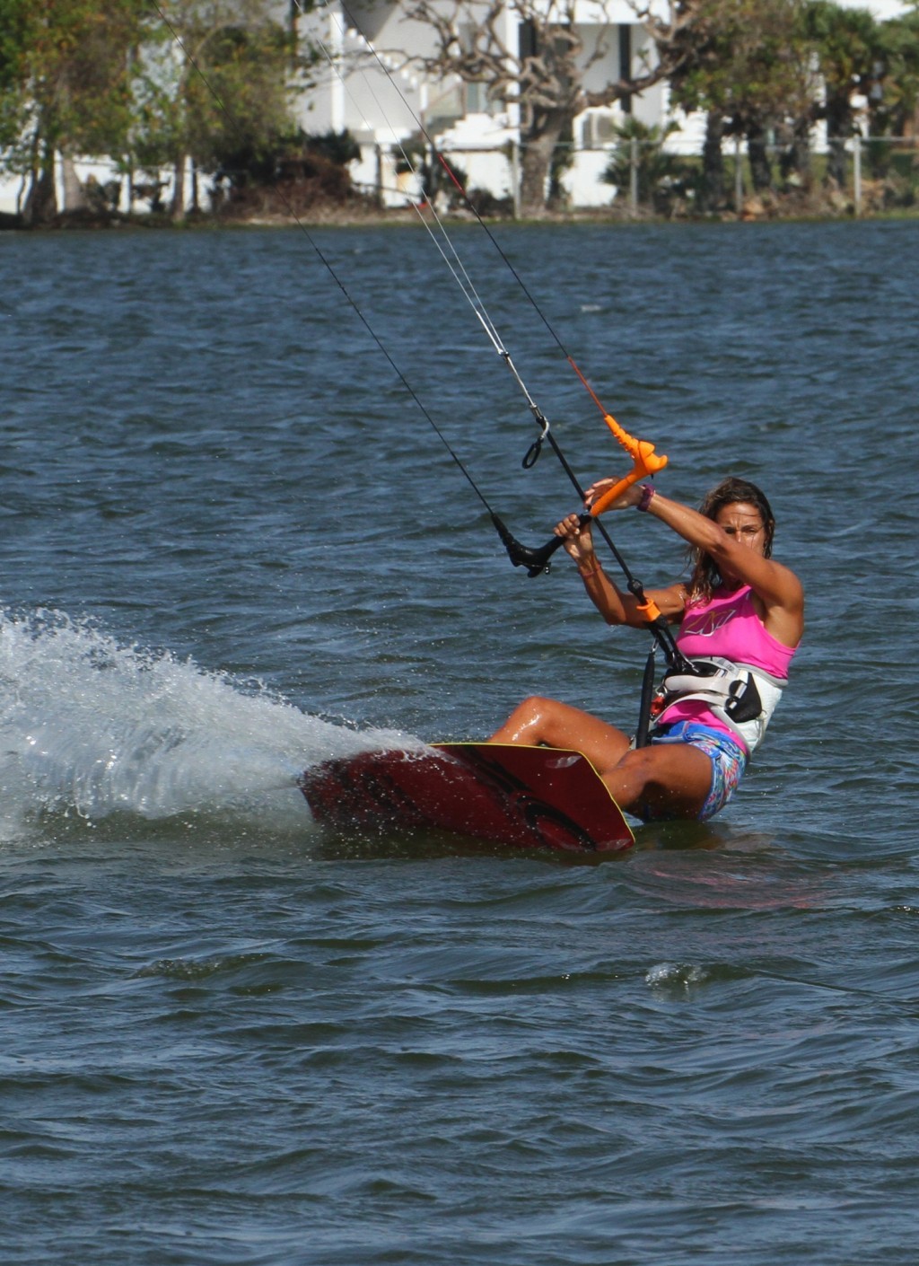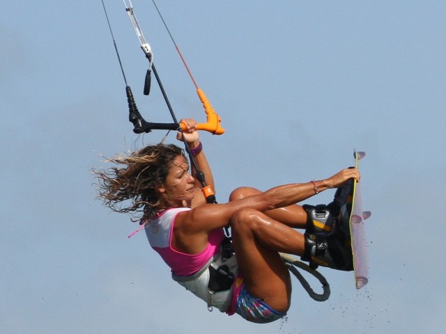Due to what’s coming, you’d prefer to get your grab in early. The timing of your down loop means that you can’t get too far around the rotation, and you can’t be grabbing late. So as soon as you’re up and off, you need to get things moving towards the grab. For the Indy, you’ll be grabbing the toe side edge between your feet, so you need to bring both knees up together to get that part of the board near enough to grab. It’s very tempting to pull the back leg up, but then you’ll be more likely to grab by your back foot which in fact be a tindy, no problem, but purists won’t be happy. In the pic, you can see that Karine is still steering the kite forward with the bar in, as she actually wants the kite to fly just past 12 o’clock before she down loops it, and she’s looking at where she wants to grab the board as she reaches down for it.