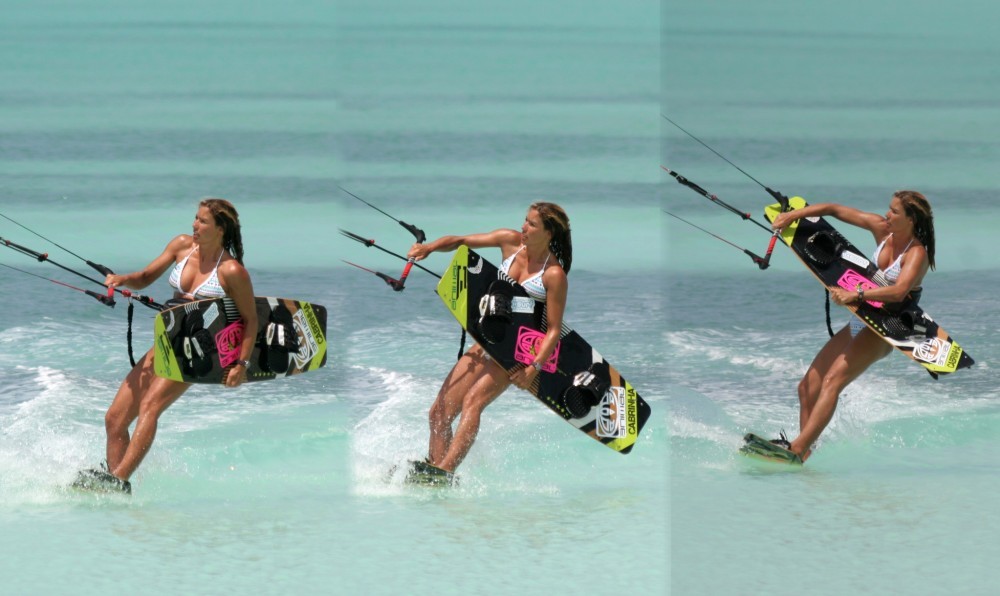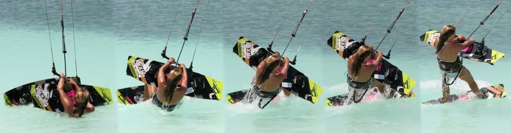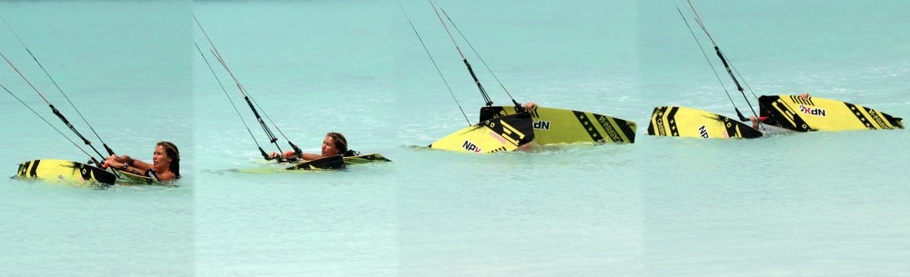 Looking at Karine’s bar throughout the sequence you can see how she doesn’t get much leverage on the down stroke, but we already have the solution to that as mentioned above. The greater problem is stopping the kite diving down into the water and getting it back up without an aggressive tug on the back hand. Anticipation is the key and the timing will depend on the size of kite you’re using. In the penultimate picture where Karine is just about up and onto her edge, you can see that she is already steering the kite back up, to make sure it will get back up there and give her the possibility of working it back down for some extra grunt. Once up and riding like this you should be able to ride to wherever you like with minimal fuss.