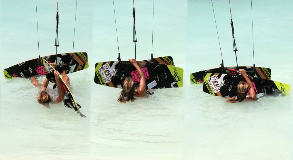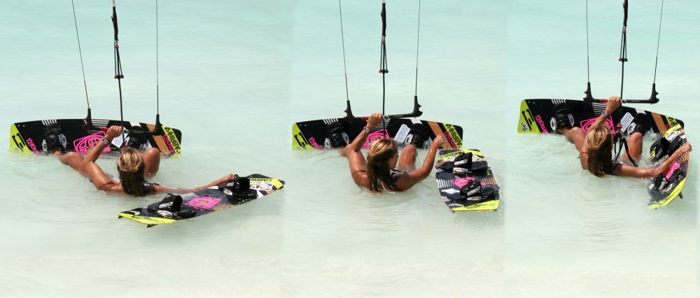 Following onto Sequence 2, also from left to right, Karine lifts the board in an effort to get it over her chicken loop. You can see in the first picture how she leans back to make room for the board. She keeps control of the kite with her left hand and by keeping the bar sheeted in, uses the lift from the kite to keep her head above the water. In the second picture you can see that she is holding the board with her right hand, whilst resting it on her body and left arm. Finally Karine releases the board from her right hand so that it can rest on the chicken loop and her knees, which are bent up underneath her. With the board now balanced she can grab the bar with her right hand and extract her left arm, bringing it back over the board so that she is in the ready position to water start.