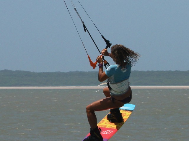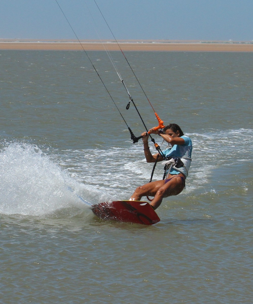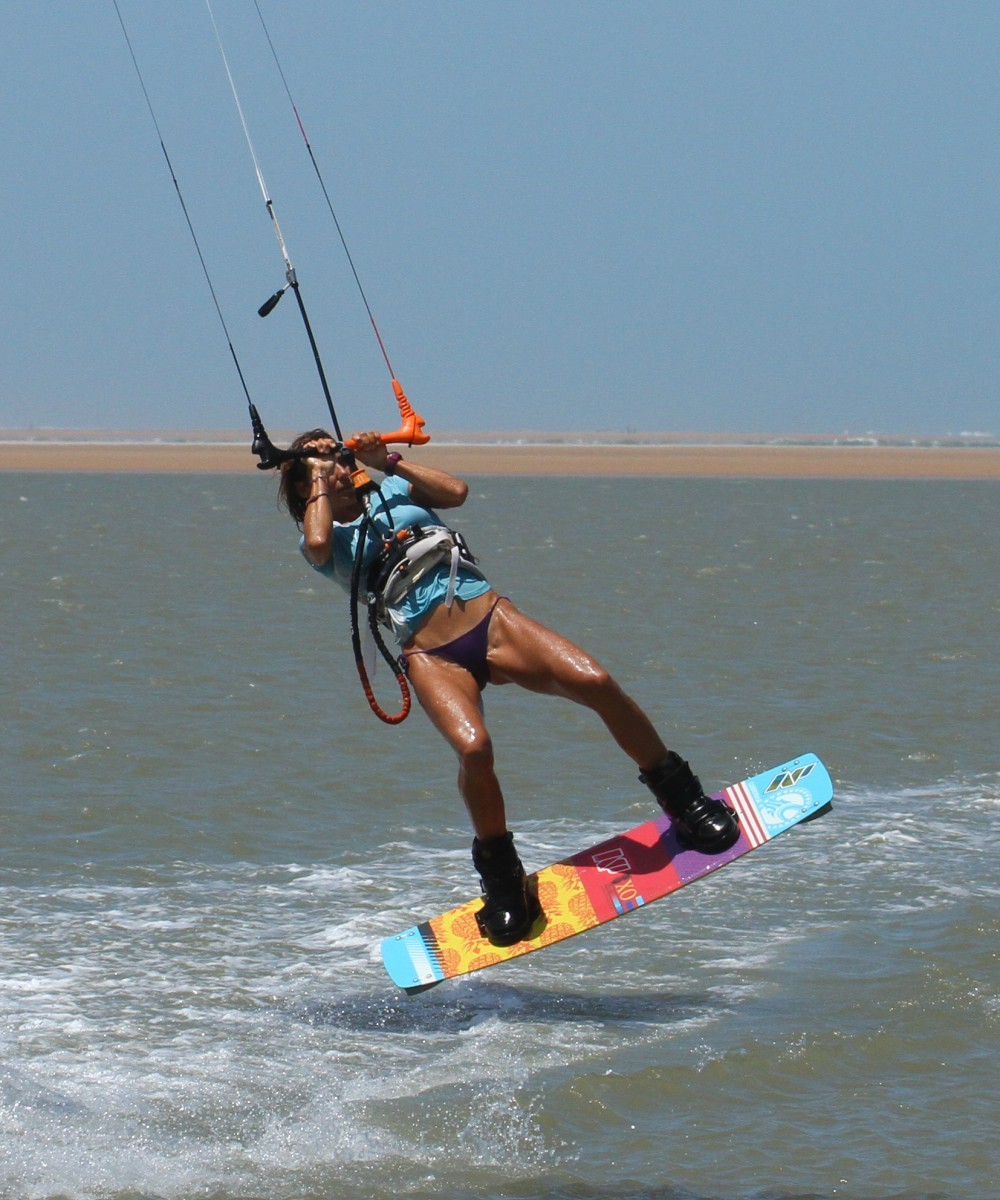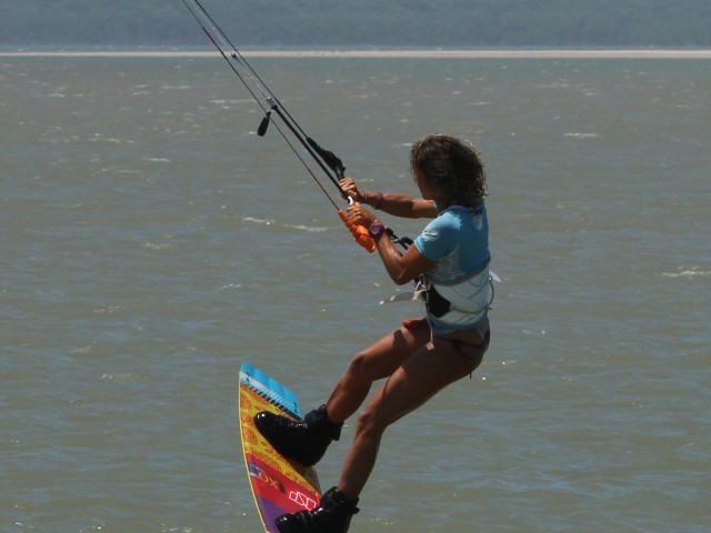 A sum of all the previous parts. With the kite pulling and her back knee high, Karine keeps the kite turning and allows herself to be pulled downwind whilst she brings the back leg through to land right foot forward. It’s worth keeping both hands on the bar as if you let go with your non pulling hand it will encourage the other foot to come forwards for landing and you’ll also most likely let the bar out, which will slow the kite, make it flutter or crash it into the drink. Once Karine has landed she’ll fly the kite up and forwards whilst carving back upwind.