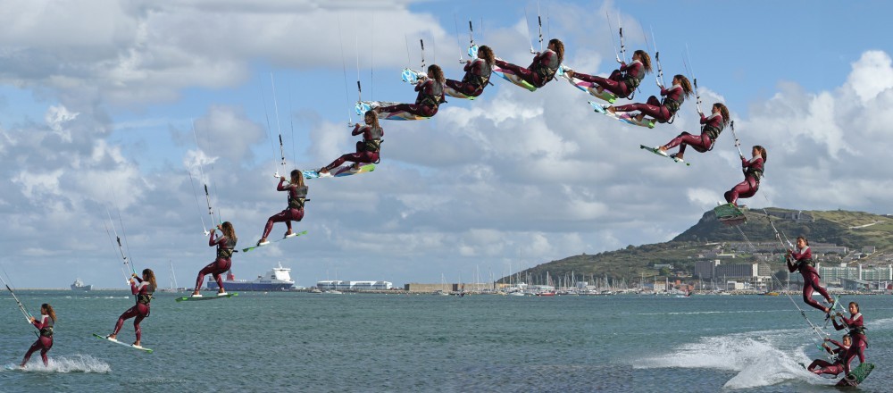 You’ll be quite busy on the way up as you want to get your grab in whilst rising, or at latest by the top of your jump, as this will make landing with control a lot more simple. First and foremost you need to maintain tension on the lines for float and to keep control of the kite, so keep the bar in. On the way up Karine brings her bar in and whilst she still has two hands on it she makes sure that the kite is not left behind her by levelling the bar out. For float and balance you’ll ideally have the kite just behind 12 once you’re up. If you feel the urge, now is a good time to look at your kite and check where it is. At the same time Karine lifts her knees up towards the bar, so that the board is in front oh her. Finally once the board is up and the kite is high Karine releases her back hand! With her front hand near the centre of the bar the kite won’t move when she lets go, and neither will yours.