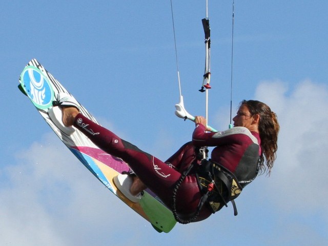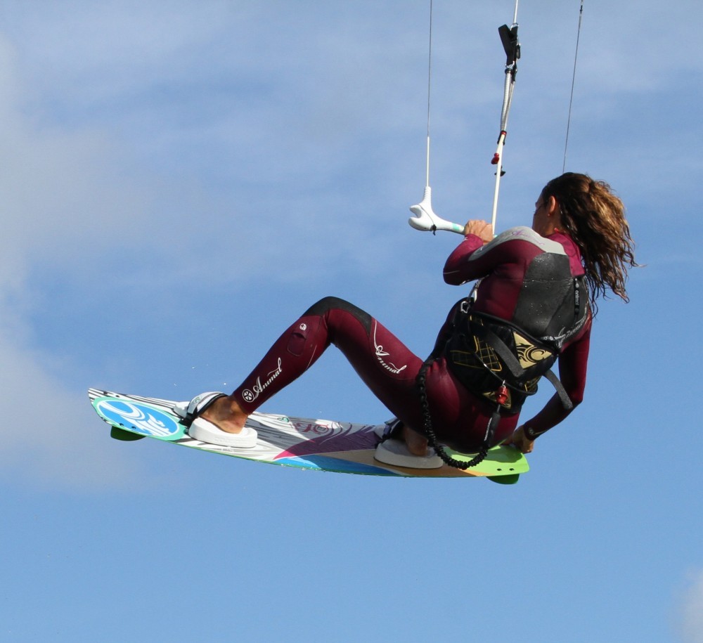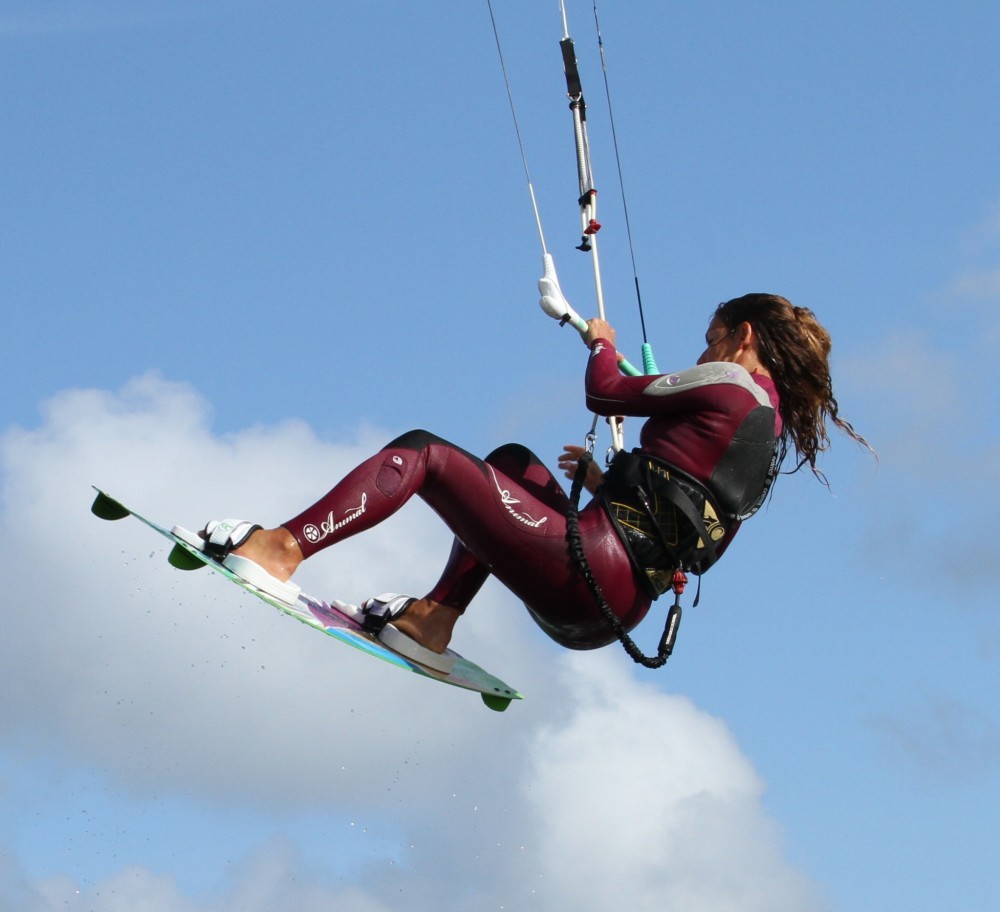 Believe it or not grabbing the board with your recently freed hand will feel more balanced than leaving it to blow around in the wind. At first just reaching down and touching your board will suffice, but as your confidence grows you should aim for a decent grip somewhere on the tail of your board, either the end or the heelside edge around the fin. You can try this sitting on the beach, but if you can muster a quick glance at the tail whilst airborne, you should be able to reach it because your legs and stomach have done all the work, bringing the board up to within grabbing distance. You can see that Karine is not leaning back, but upright with the bar in, the kite above her and her knees tucked into her chest. So the board is right there. One important thing to note here is, don’t be tempted to go for the grab too early. This may encourage you to only bend the knees and flick the board up behind you. This will not be such a stable position in the air and definitely won’t look as good.