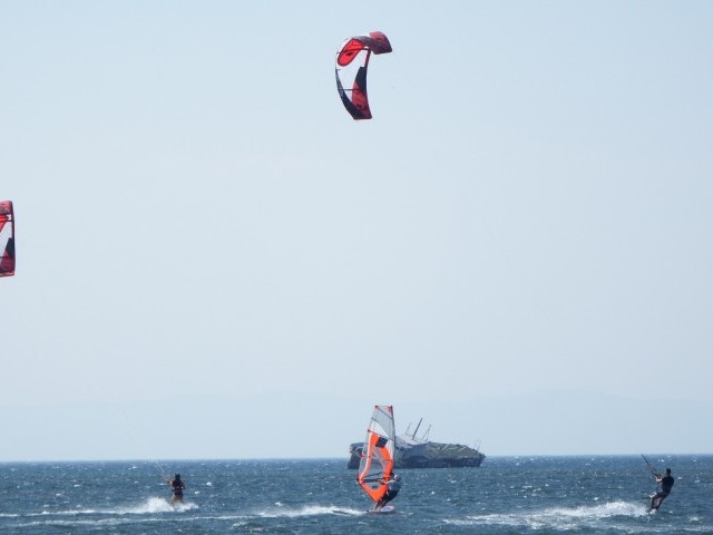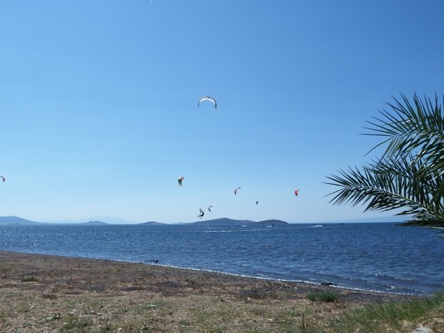 In Ayvalik the wind comes mainly sideshore but can occasionally turn a bit to side on-shore. This means you can enjoy the whole expanse of the area and because it is flat everywhere, you will be riding your tacks from the beach to the shipwreck and beyond without it ever feeling crowded.