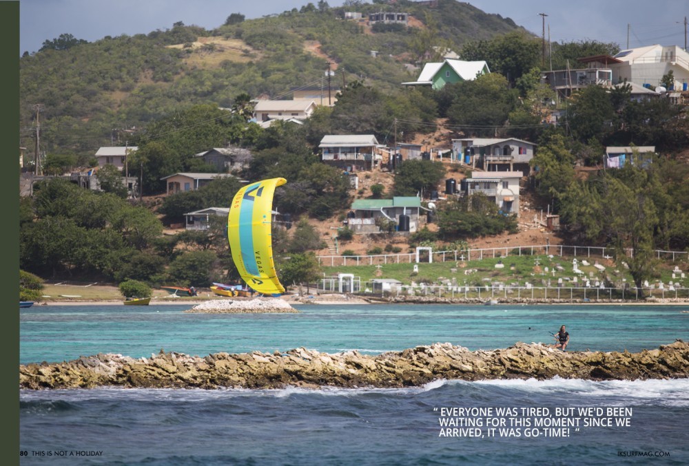 Once we were back on board, we had to continue our journey to Union Island. We got little sleep that night and woke up early to set sail sail. 14 hours later, we arrived at a beautiful island wedged between two mountains. The water was turquoise, shallow and warm - ideal for the cover shot of the video! We were all super stoked and decided to pop a bottle of champagne - a toast to a successful day! Late that evening, we finally made it to Union Island, and we couldn't wait for the following morning.