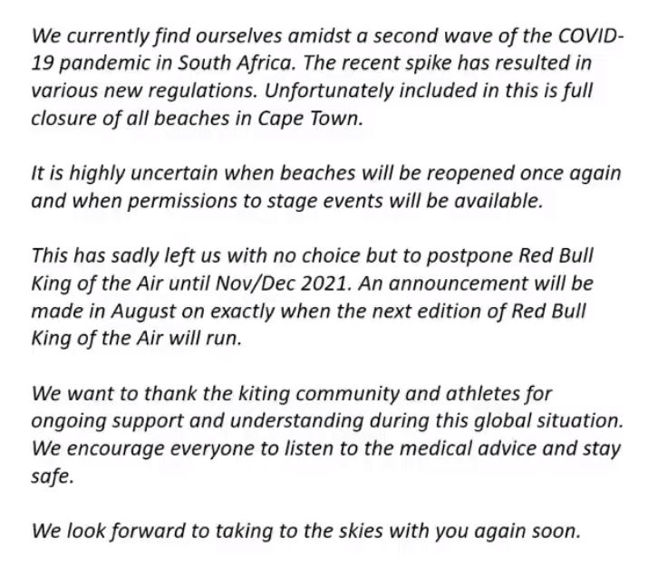 It is hard to argue this decision, which, while unfortunate, is a necessary one. The kiting community and big air fans will have quite some time to wait before the 2021 Red Bull King of the Air is crowned.