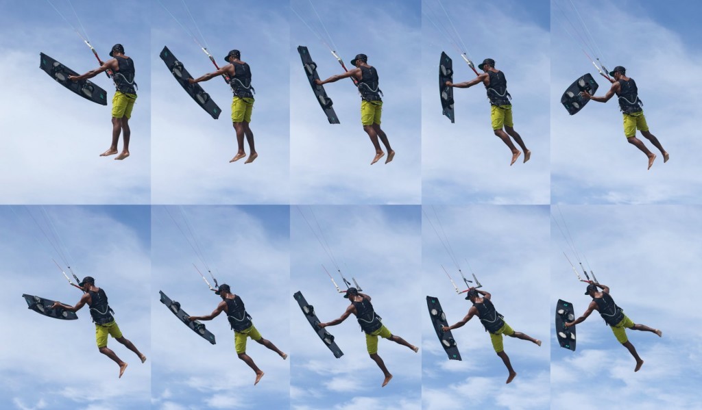 Once you’ve completed the Varial you should hopefully arrive in a position that you’re more accustomed to if you’re already a board-offer. The main point to consider now is what’s been happening with the kite whilst you’ve been concentrating all your attention on the board. For the more experienced you’ll have done what you normally do. For those of you earlier in your board off careers, a quick refresher. One handed in the air will always feel more balanced if the kite is flying just behind 12 o’clock. In this example where Heliarde is jumping left to right, he has the kite between 11:15 and 11:50. It sounds silly, but too far back and you won’t have float, whilst any further forwards you’ll be pulled off balance and away from the board. It’s also essential to keep the bar in on the sweet spot, otherwise you won’t have the required float. Having your front hand centred on the bar helps keep the bar in without moving the kite too much. You can see here that although Heliarde has completed the Varial, his kite is still slightly behind him. The result, plenty of float and oodles of balance.