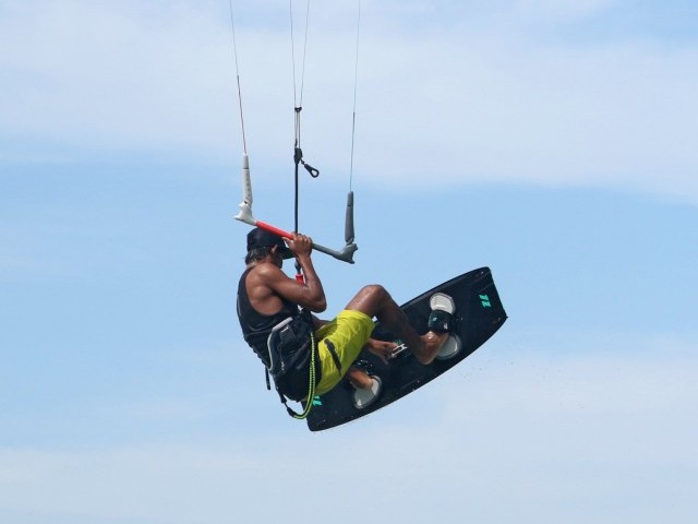 This really is a timeless classic. It adds some flair to a straight board off and brings back fond memories of the Space Monkeys generation and all their peers, spinning the board around tirelessly in competition the year before Martin et al went boom into freestyle:) A while back we covered the tail flip varial. Now we’ll go through the handle version, which is easier in strong winds as you keep the board under more control, and it requires less wrist strength. However, you’ll need a bit more cooperation from your body, as any handle tricks do require a tad more suppleness... If you’re going for this, we’ll assume that you’re happy jumping, that you’ve attempted a board off before, and at the very least for the more rambunctious amongst you, that you can grab a straight jump. The aim being that you’ll be happy removing a hand from the bar and concentrating on some in flight twin tip juggling. Big air maestro Heliarde is on hand to demonstrate the finer points, so let’s crack on.