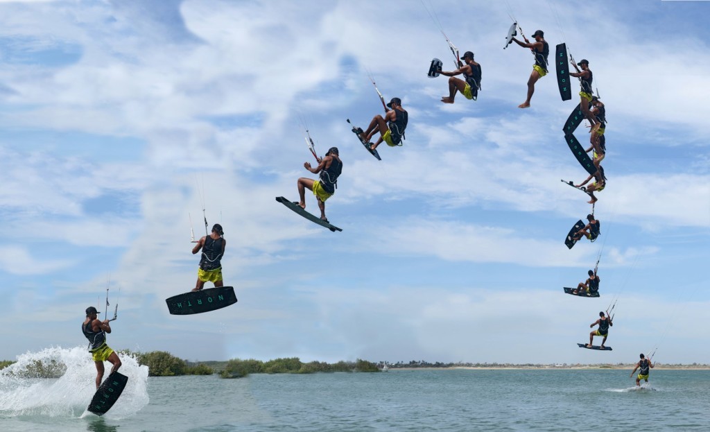 Unless you’re a gymnast, contortionist or part time Ninja, a bit of time, float and height will dramatically increase your chances, so you’ll want a decent edge, some speed and enough oomph in the kite. If the conditions allow, a larger kite will make life easier, as it won’t rip you off the water, so you’ll be able to get your knees and board up sooner. You’ll also get more hangtime and the kite won’t be tempted to stray as easily as if you’re one handed on a 7m. It’s also less intimidating if you’re not hammering downwind whilst airborne, so do feather the bar out on take-off to make sure that the kite flies up to 12 o’clock and not across the window. You can see that Heliarde has the edge of a champion, he’s sent the kite up and is feathering the bar out on the sweet spot so that he can hold his edge and get maximum height for minimum drift. And don’t forget to either wiggle your feet back on the pads a little or loosen the straps a touch, so that it’s less of a struggle to get the board off your feet and back on again.