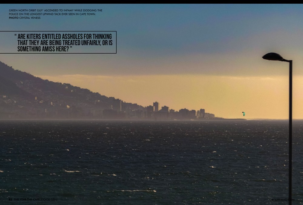 The police blitz on kitesurfing moved down the coastline to Bloubergstrand, where police had been chasing a mystery rider on a green North Orbit up and down the beach for hours without success. Local rider Andrew Tompkins had been out for an evening session, and unaware of the drama unfolding upwind, found himself bearing the brunt of the police frustration when he landed his kite on the beach after dark.