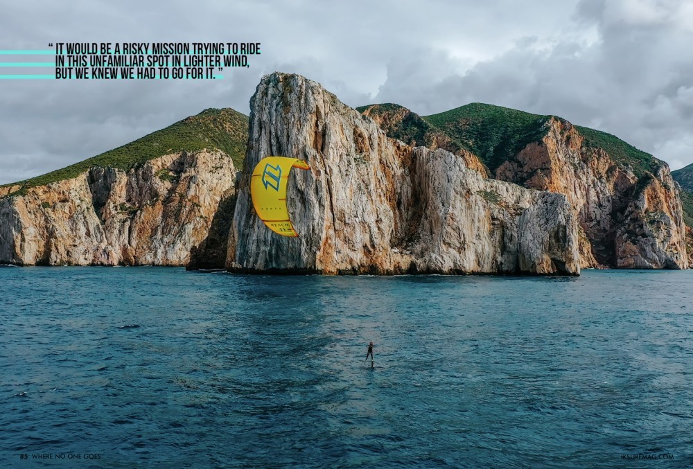 When we arrived with the catamaran, the wind was blowing 10-12 knots, side on-shore. It would be a risky mission trying to ride in this unfamiliar spot in lighter wind, but we knew we had to go for it. With the help of the crew, I launched an 11m North Reach from the boat. The conditions would be most manageable with light wind gear, so I grabbed the foil, curious to see how close I could get to the island.