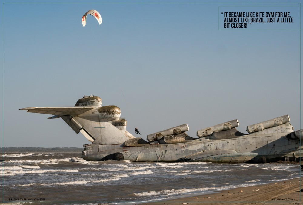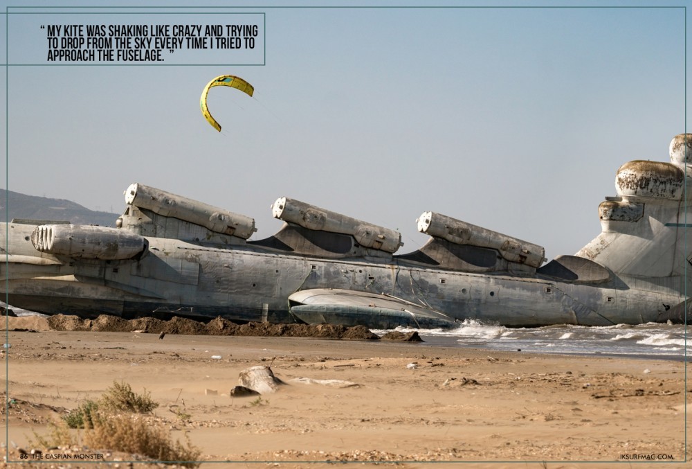I like to ride in unusual places and around unique objects, so arriving at the Caspian Monster while it was still stuck in the sand was a jackpot! I spent the entire day riding as close as possible to this strange craft. From the upwind side, it was fascinating to examine every detail. At 19 metres in height and 73 metres long, I was in awe of its size. I could easily fly my kite under the back wing of the plane. The downwind part was harder to explore because the Ekranoplan's magnitude created turbulent wind and a massive wind shadow. My kite was shaking like crazy and trying to drop from the sky every time I tried to approach the fuselage.