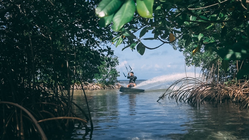 Each year, we go explore the mangroves and islets looking for wind. The first islet is about 2.5 km from our starting point, and difficult to reach in a kayak with all of our camera and film gear. To combat the wind in the kayak, we had one of our crew sit at the front seat with their kiteboard in the water to create something like a fin or a keel, to avoid drifting.