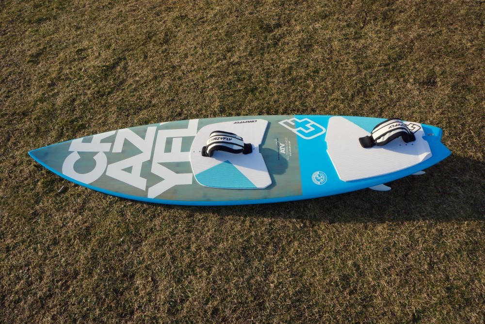 The 6’0 Crazy Fly ATV arrived on a day with very uninspiring 2-foot onshore mush. Very easy to set up, we opted for the Thruster set up and straps so we could chuck it around and try and make the most of the conditions. We needn't have worried, this thing made even a sloppy crumbling face feel like getting pitted at Chopes… well, we exaggerate slightly, but it certainly made the wave feel more radical than it was. The Thruster set up really allows you to throw the board around and make mistakes without getting chucked off over the front, couple this with the straps for those just starting out, and every lump and bump is something to be smacked. The board gets planning very quickly, even in light winds, and holds speed well. It is on the larger side for a kite surfboard at 6’0, so smaller riders may find they want the smaller 5’10 version which, with a little less size and volume, is a tiny bit more nimble underfoot. This is not to say the 6’ is not, in fact far from it. When riding powered with the Quad fin set up, the ATV grips and drives ferociously through the turns really accelerating you forward to hit that lip or perform that perfect roundhouse cutback.