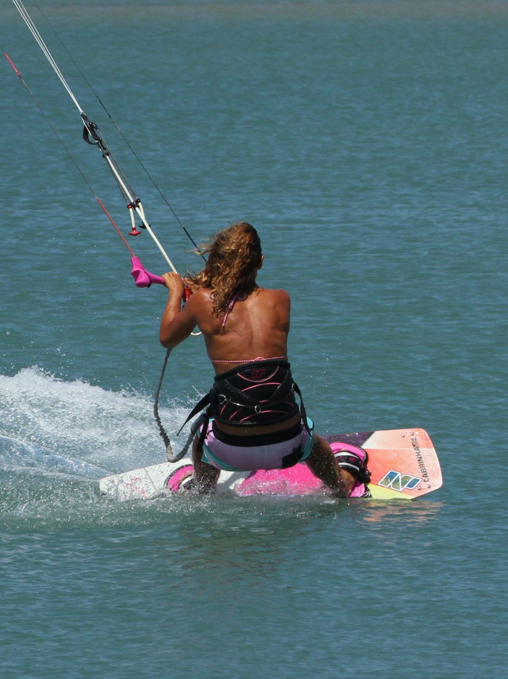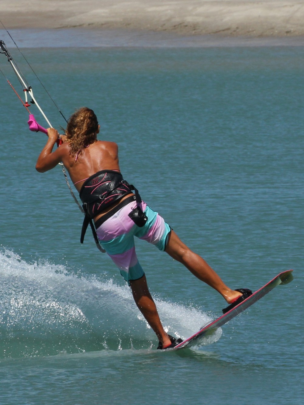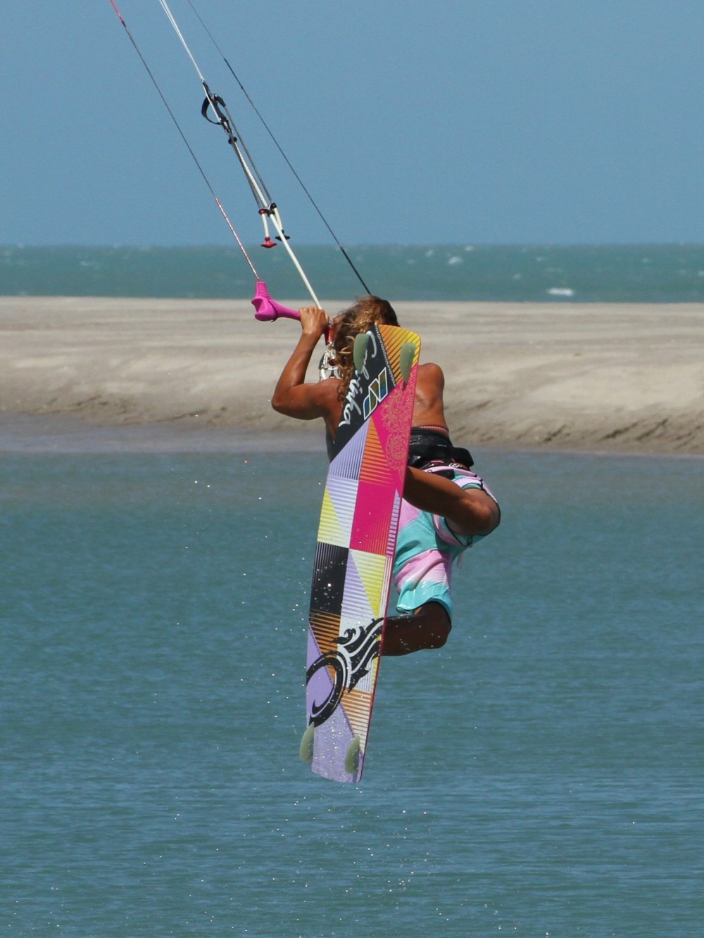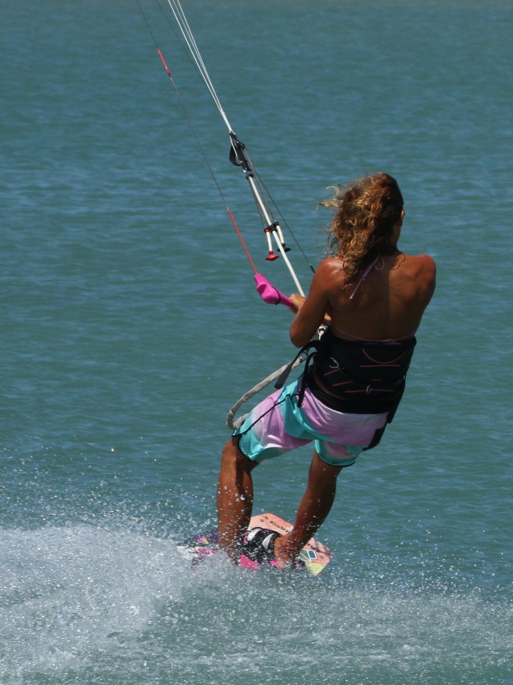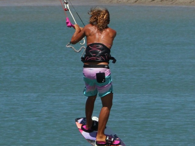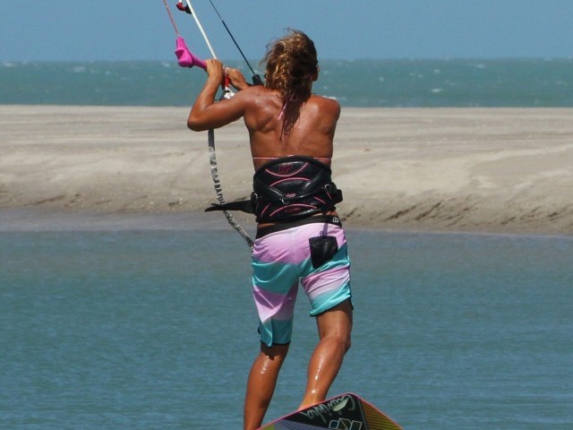 As with all things pop your approach will determine how well things will turn out. You can see in the picture that Karine has her kite just below 1 o’clock, she has turned the board off the wind onto a very broad reach, whilst keeping her weight both upwind of the board and back towards the tail of the board. Her front leg is extended and both her elbows are tucked into her sides. Not only is this the perfect position from which to unhook, it is also the perfect set up for a Raley..
