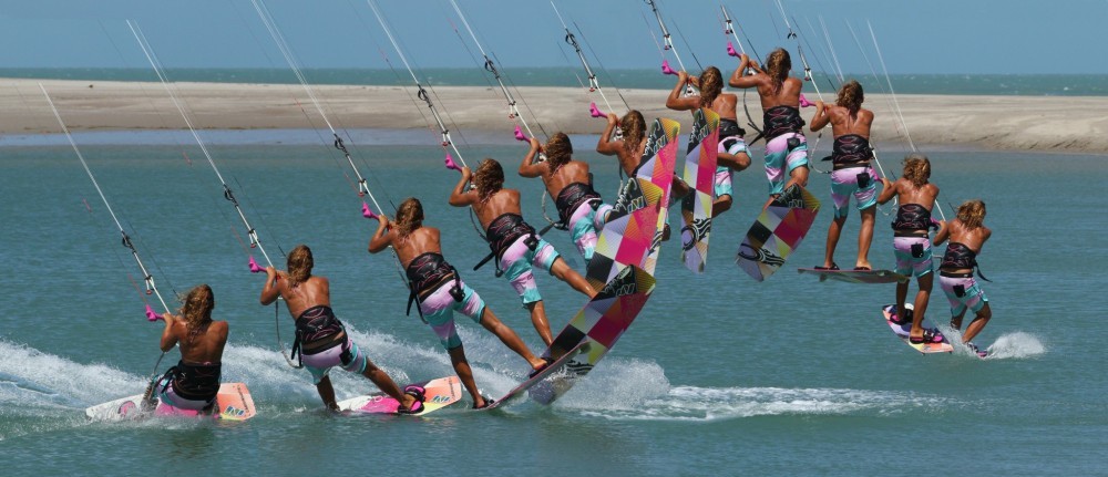 A raley is merely an extreme pop. If you’ve managed to resist on the aforementioned platform you will be in a position to, and have something from which to pop. As the board turns underneath you it’s time to stamp. Karine feels the board turning under her, and more importantly feels herself being pulled forwards by the kite. This is her cue to pop. She pops hard against the board with her back foot by stamping down and extending her back leg as explosively as possible. Her front leg has remained extended throughout. The amount of pop you get will depend on a few variables – speed, power, timing, aggression, but your aim is to extend, really concentrate on straightening your legs, uncoiling the spring which is you.