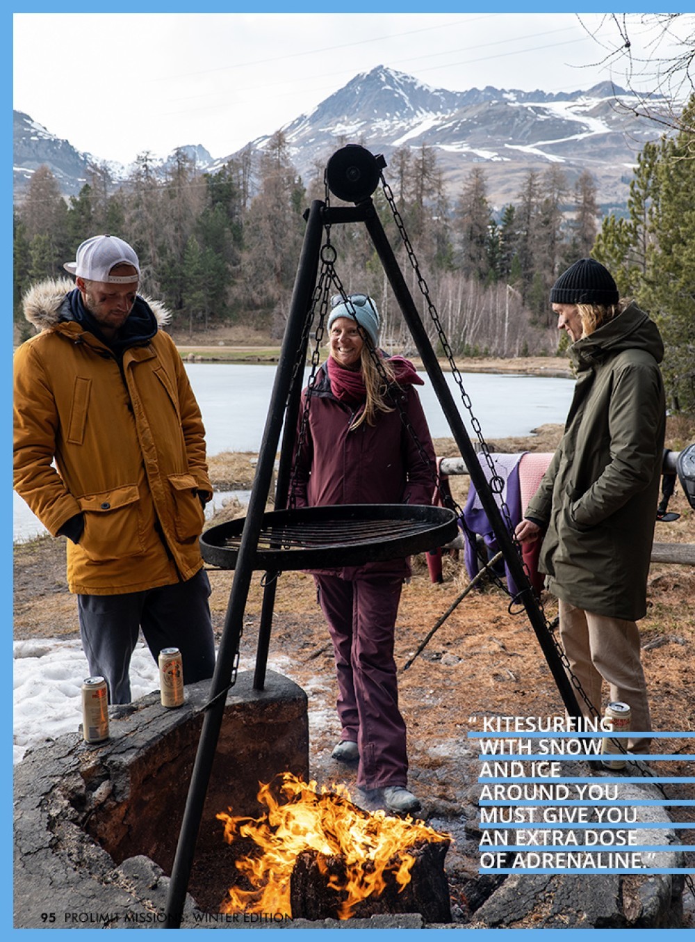 At 1815 metres above sea level on a frozen lake, it's hard to imagine that a thermal wind is even possible. Yet, it is. As long as the land masses are no longer covered by snow and can catch some sun, the wind will kick in at 12 o'clock every day. Lucky for us, it did, and it was a very special feeling. At 10:30, we were still enjoying the nice weather in our Prolimit sweaters, but after 12 o'clock, with the wind blowing, it felt like -20°C. We could even see people skiing from where we stood at the kite spot. How crazy is that?!