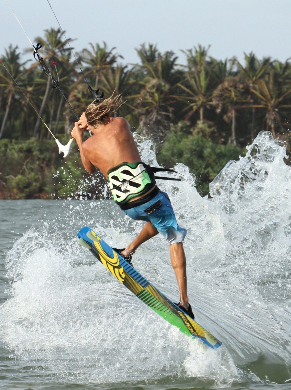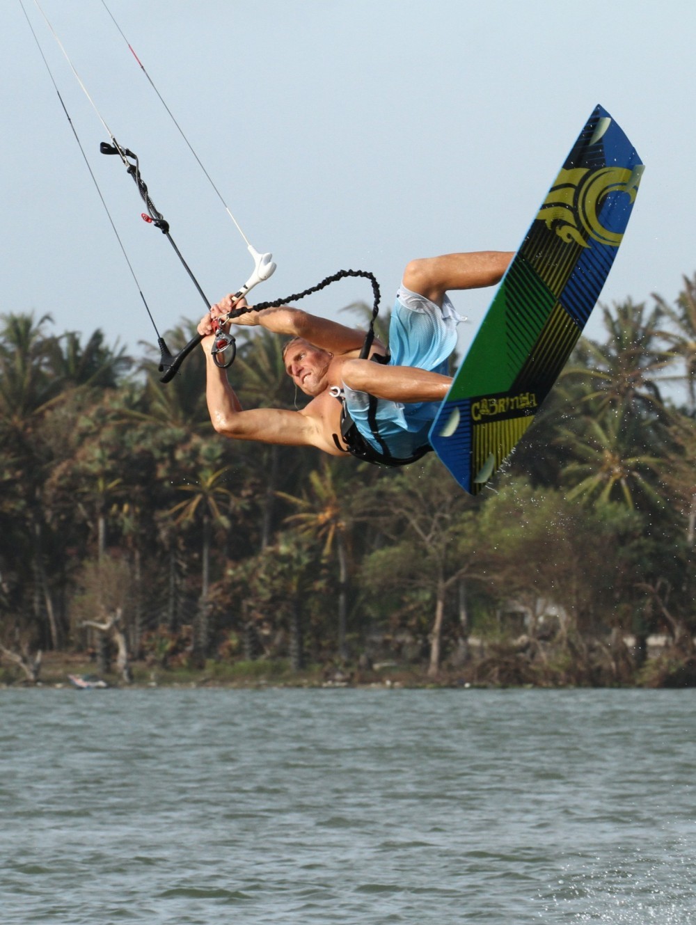 This is the make or break moment requiring full commitment and energy. Timing wise you should be just about to drop, that lovely floaty nanosecond before free fall. Most likely it will feel too late, and if it does that’s perfect! In short you pass as you drop out of your rotation. Whilst your knee and bar move towards each other you have to turn your back on proceedings. Give one last tug on the bar with both hands, a bit front hand heavy to stop the kite flying up when you release it and then throw you head and shoulders back around, down and away from where you’ve been looking. Assuming you’ve already been wrapped or passing the drill is the same, fast and deliberate, twisting the bar as you release your front hand to allow your shoulders to turn further.