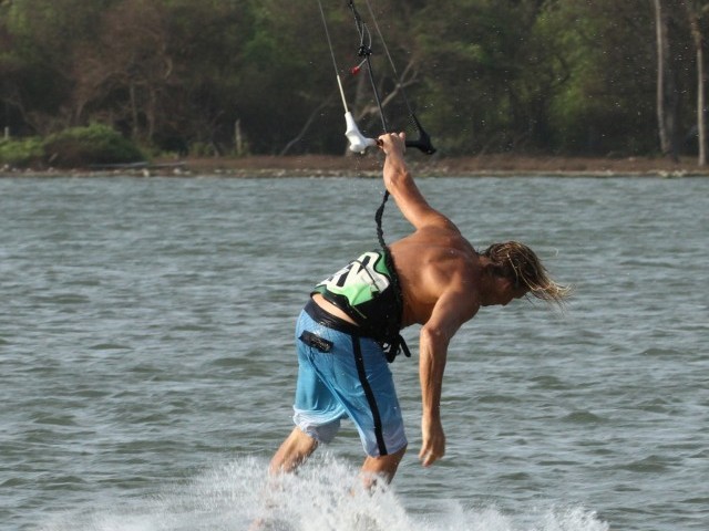 In the picture the tail of Christian’s board is high, his knee and hip are close to the bar and he’s leading his pass with his head. He also has his complete kite face on, as this is 100%. With the board high and his knees bent the board won’t drop and pull him away from the bar as he turns.