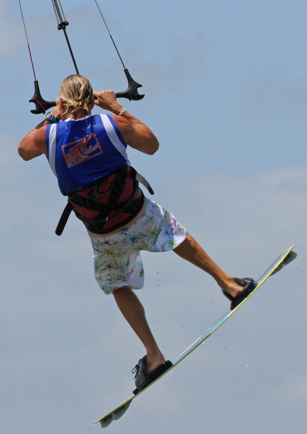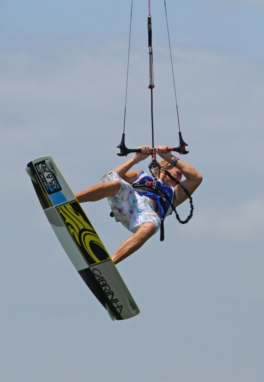 - Pic 6. One down, one to go! Make sure that you can fell the kite is floating you. Christian keeps the bar in and tucks his head down and around to keep the momentum going.