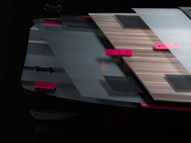 Each board has a custom core thickness that is individually fine-tuned to ensure consistent characteristics throughout the range, regardless of size or weight. The core thickness variations and taper, as well as detailing longitudinally and laterally, play a significant role in controlling the board's overall flex and feel. Additionally, board-specific laminate layups allow for further fine-tuning of the flex and overall characteristics of the board.