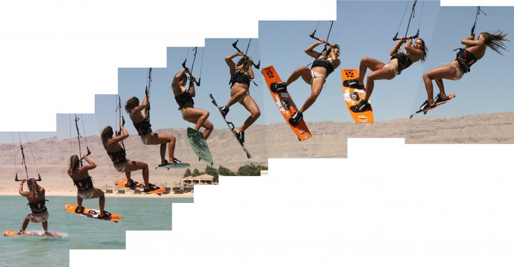 - Pic 1. As per a normal jump or back loop Karine has sent the kite back and carved hard against the moving kite, resisting with both legs.