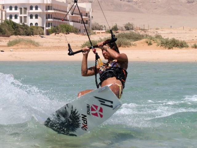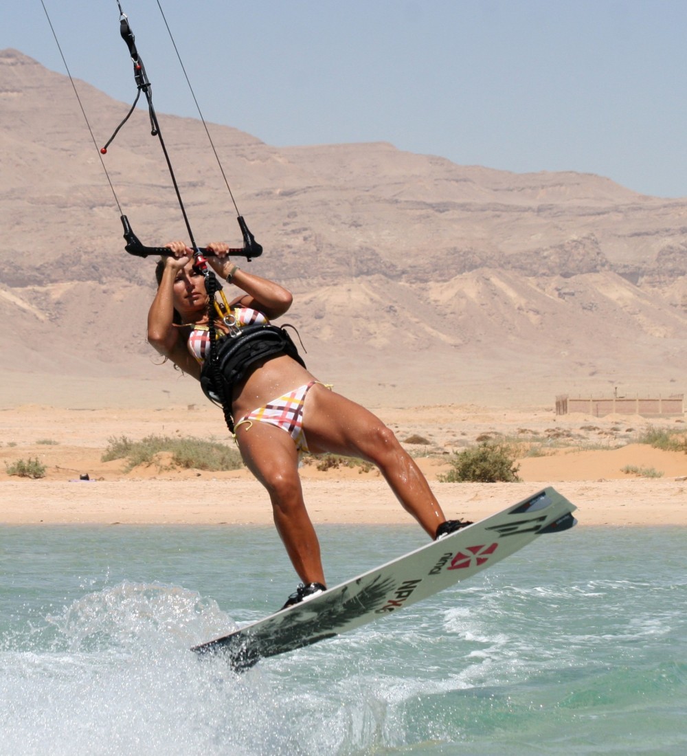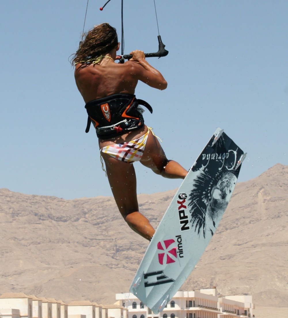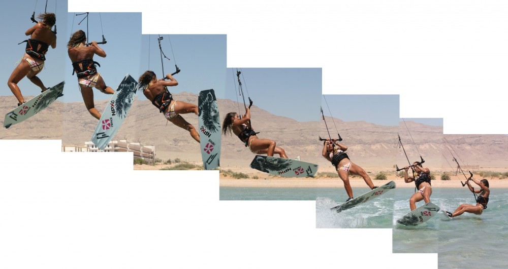 - Pic 2. As she takes off, Karine leans back and keeps the board in contact with the water, turning it up into wind even harder and starting her rotation a little bit more forcibly than normal. You can see she has not thrown her head around into the rotation but instead has concentrated on making sure the kite gets back above her by pulling on her front hand.