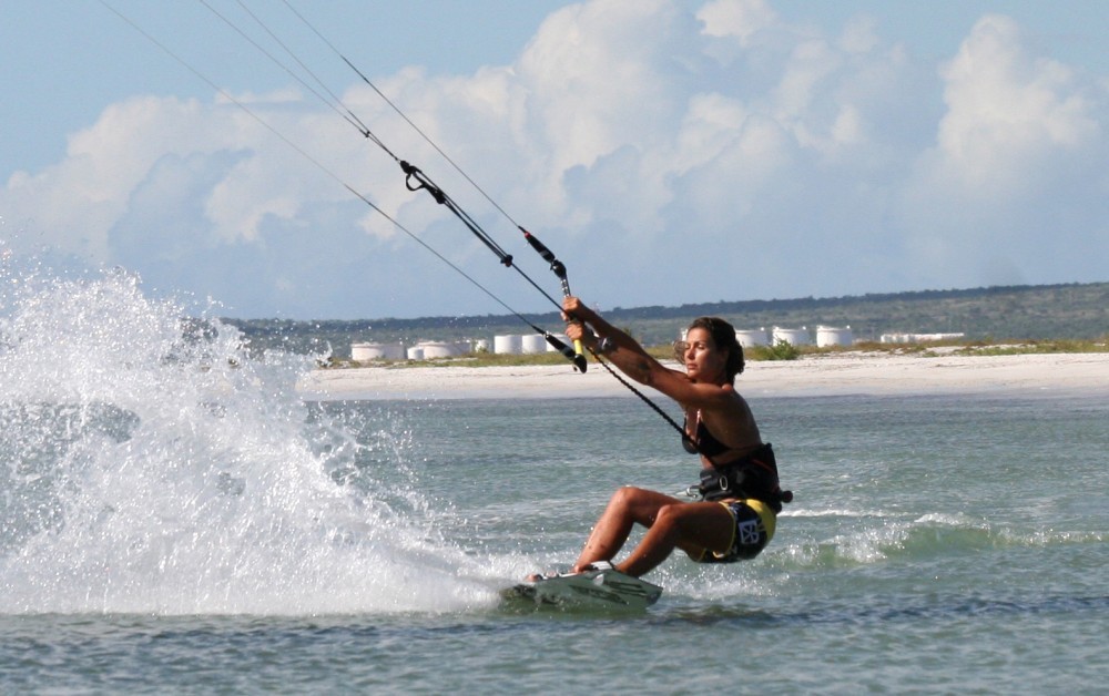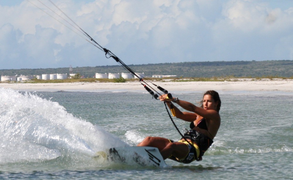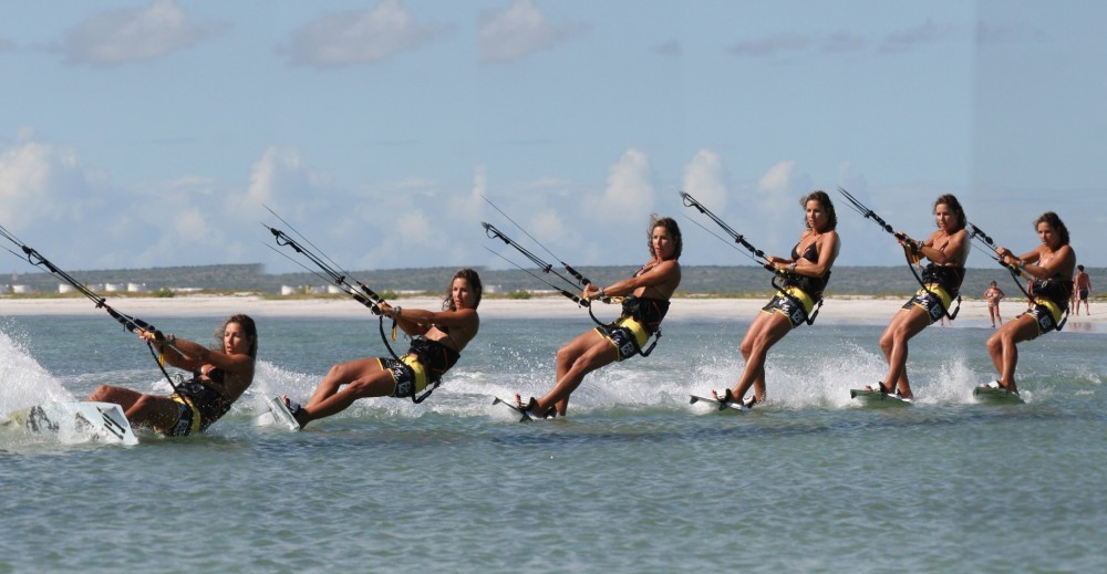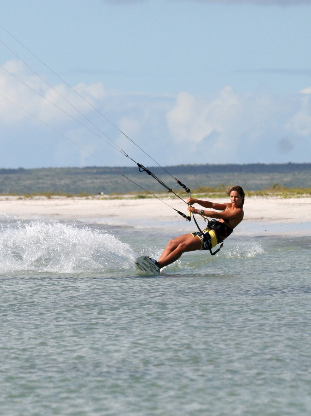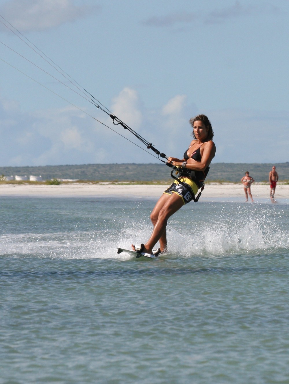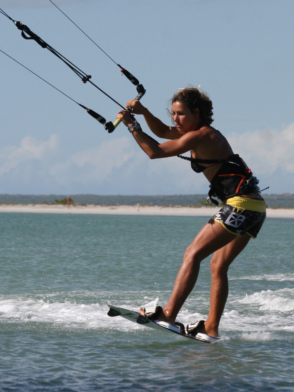 - Pic 5. With her shoulders leaning back into the wind and her hips moved over her back foot, Karine can now start to resist against the edge of the board, driving against the edge with her legs and turning the board away from the kite. Best kite face please.