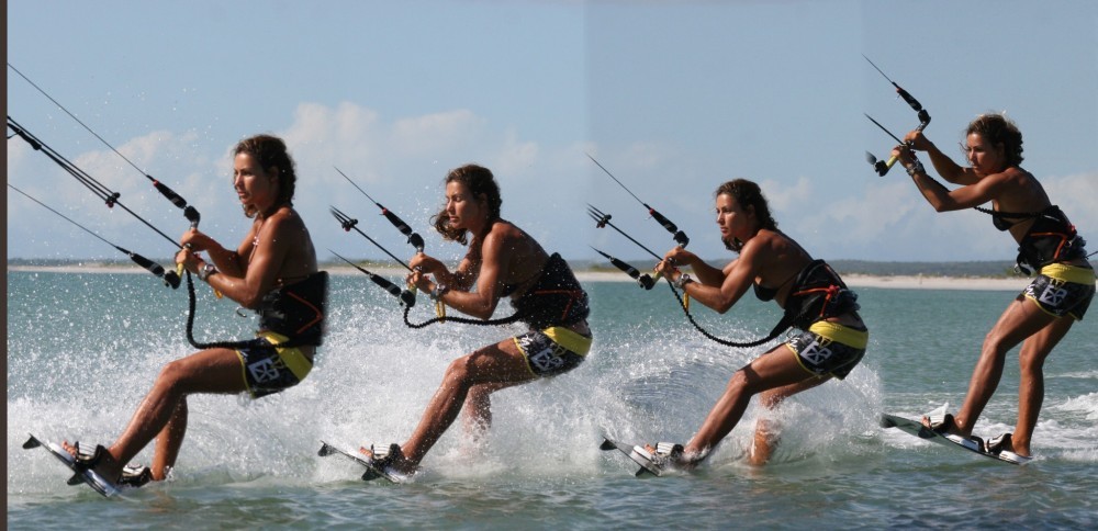 - Pic 6. The edge of the board is well and truly biting. With Karine’s weight on the back foot and her shoulders committed well up wind she has successfully put a load of tension back onto the lines and built up the necessary energy to get herself pinged off the water. Tally-ho.