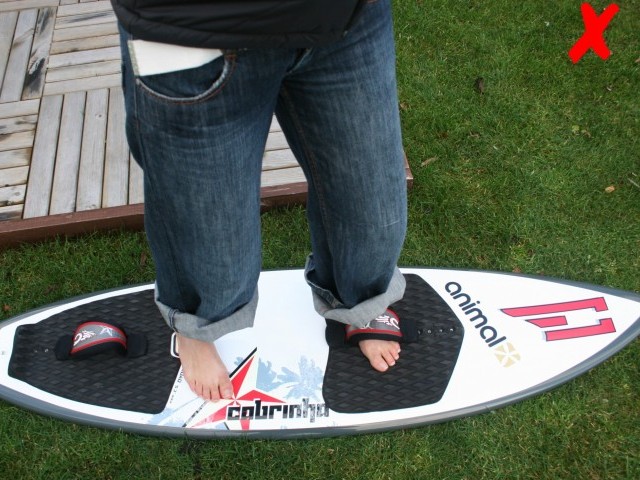 In Pic B Karine has not put her foot far enough across the board and will therefore have trouble carving the board around and keeping the board tilted over onto her toe side edge.
