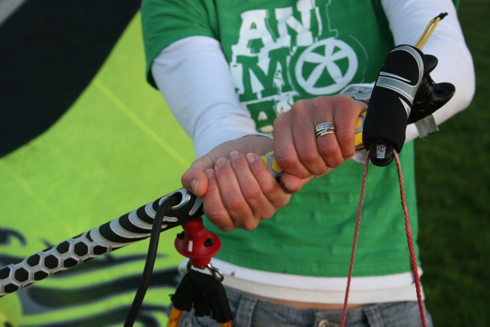 Firstly once you have unhooked, if the lines are not totally taut the kite will not move too quickly as you change you hands. This is doubly important on small kites.