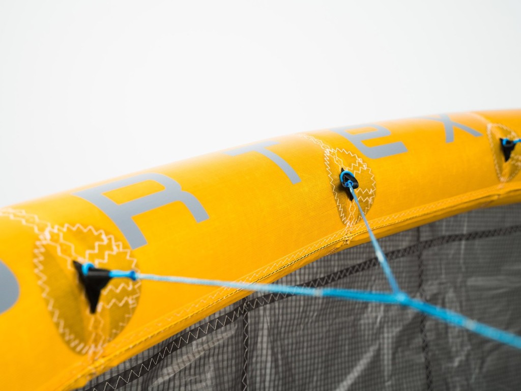 Ozone has doubled down on its new transversal shaping technique to produce an airfoil section that is as accurate as possible. The transverse sail shaping is inspired by their paragliding department and is an extra seam line close to the leading the full width of the kite. This creates many extra small canopy panels close to the leading edge, intended to create a more ‘true to design’ 3D shape and improve canopy tautness. Imagine a digital image. The greater the number of pixels, the clearer the image. In this case, the greater the number of panels close to the leading edge, the better the 3D reproduction of the intended airfoil section from 2d panels. The vortex is the only kite currently in the Ozone range that features double transverse shaping with two extra seam lines to create an even cleaner airfoil to increase available lift and reduce drag.